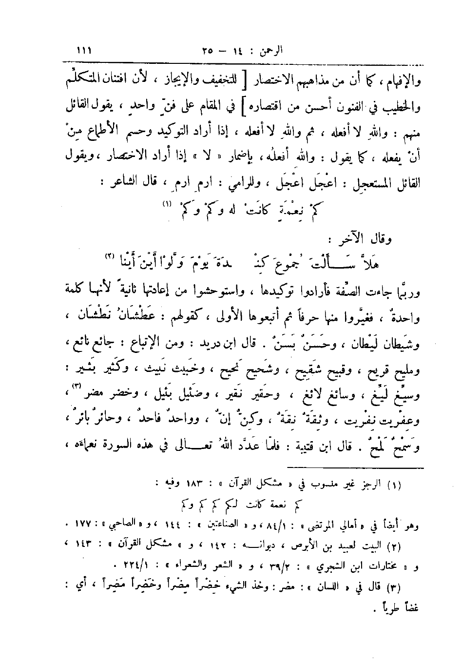 والإفهام كما أن من مذاهبهم الاختصار للتخفيف والإيجاز لأن افتنان المتكلم والخطيب في الفنون أحسن من اقتصاره في المقام على فن واحد يقول القائل منهم والله لا أفعله ثم والله لا أفعله إذا أراد التوكيد وحسم الأطماع من أن يفعله كما يقول والله أفعله بإضمار لا إذا أراد الاختصار ويقول القائل المستعجل اعجل اعجل وللرامي ارم ارم قال الشاعر ... كم نعمة كانت له وكم وكم ...