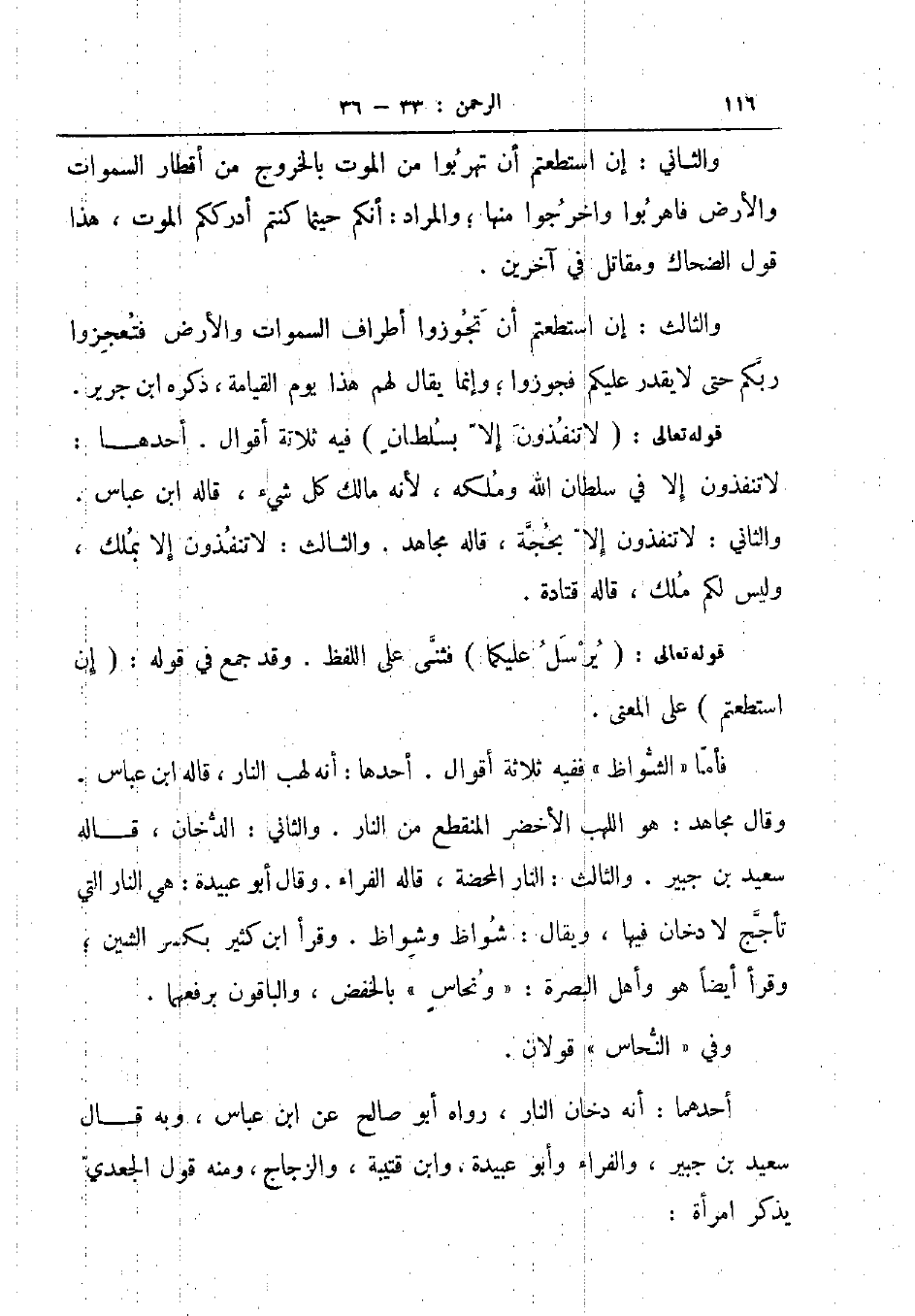 قوله تعالى لا تنفذون إلا بسلطان فيه ثلاثة أقوال أحدها لا تنفذون إلا في سلطان الله وملكه لأنه مالك كل شيء قاله ابن عباس والثاني لا تنفذون إلا بحجة قاله مجاهد والثالث لا تنفذون إلا بملك وليس لكم ملك قاله قتادة