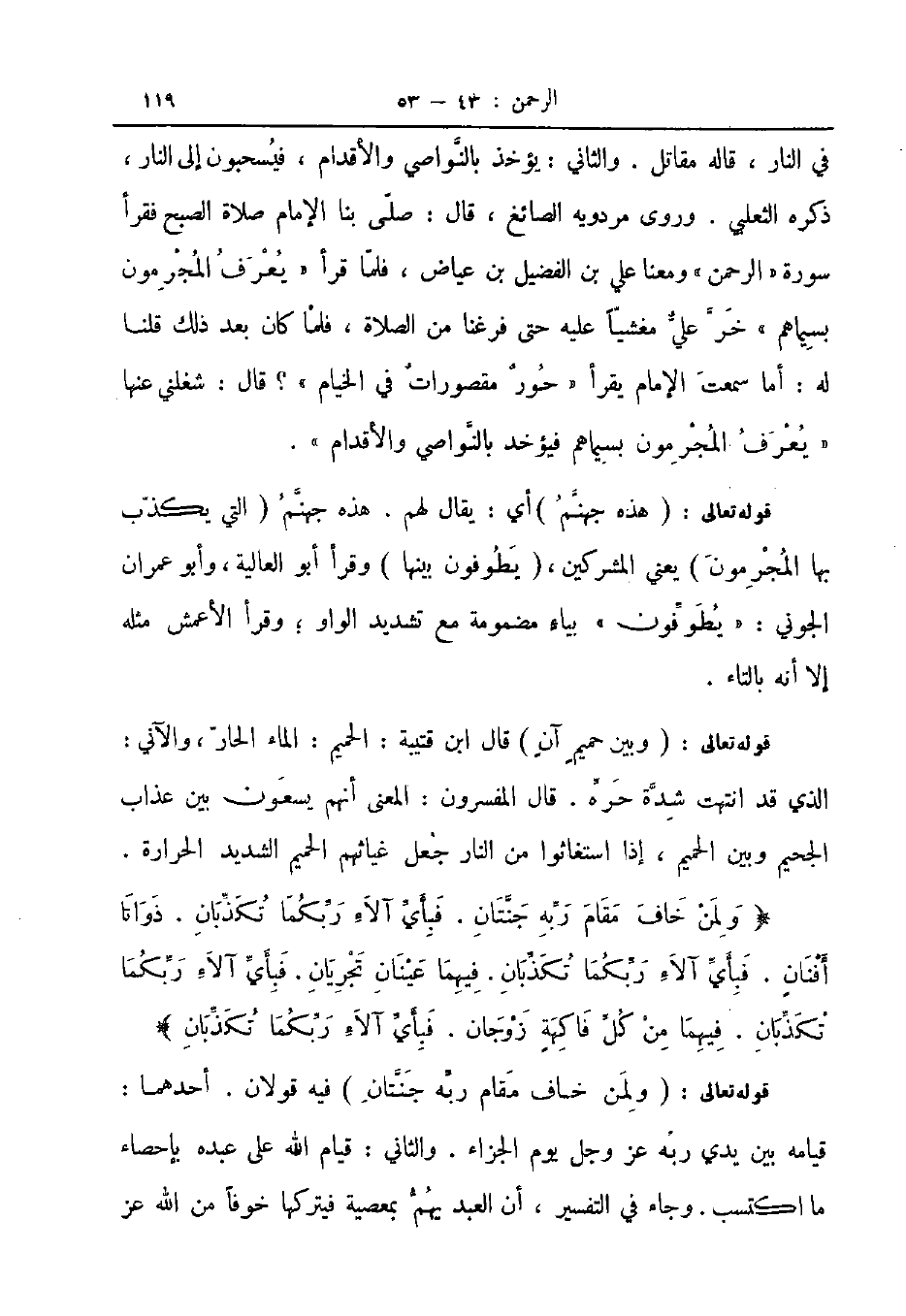 في النار قاله مقاتل والثاني يؤخذ بالنواصي والأقدام فيسحبون إلى النار ذكره الثعلبي وروى مردويه الصائغ قال صلى بنا الإمام صلاة الصبح فقرأ سورة الرحمن ومعنا علي بن الفضيل بن عياض فلما قرأ يعرف المجرمون بسيماهم خر علي مغشيا عليه حتى فرغنا من الصلاة فلما كان بعد ذلك قلنا له أما سمعت الإمام يقرأ حور مقصورات في الخيام قال شغلني عنها يعرف المجرمون بسيماهم فيؤخذ بالنواصي والأقدام قوله تعالى هذه جهنم أي يقال لهم هذه جهنم التي يكذب بها المجرمون يعني المشركين يطوفون بينها وقرأ أبو العالية وأبو عمران الجوني يطوفون بياء مضمومة مع تشديد الواو وقرأ الأعمش مثله إلا أنه بالتاء