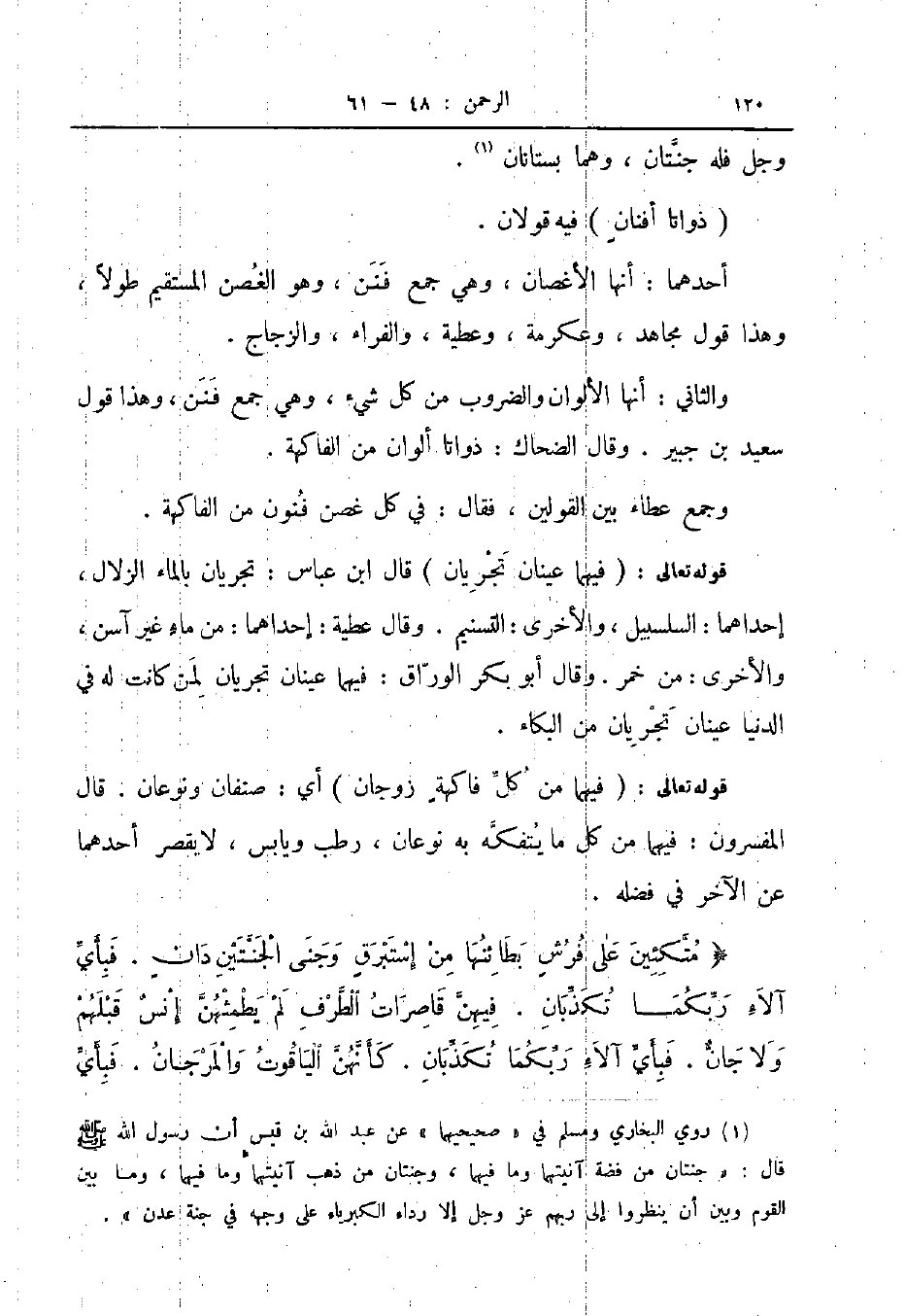 قوله تعالى فيهما عينان تجريان قال ابن عباس تجريان بالماء الزلال إحداهما السلسبيل والأخرى التسنيم وقال عطية إحداهما من ماء غير آسن والأخرى من خمر وقال أبو بكر الوراق فيهما عينان تجريان لمن كانت له في الدنيا عينان تجريان من البكاء