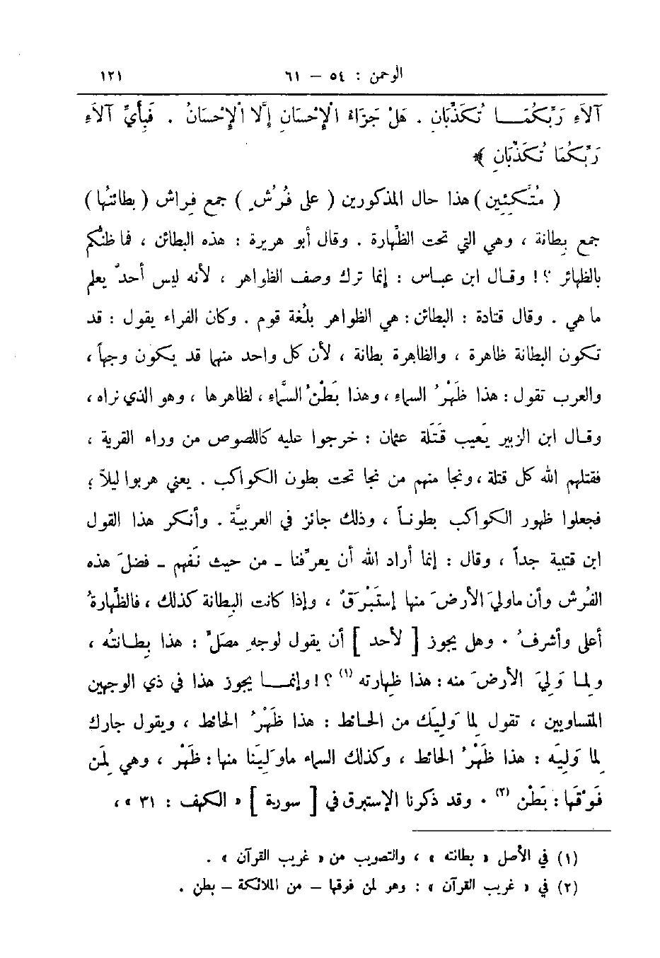 متكئين هذا حال المذكورين على فرش جمع فراش بطائنها جمع بطانة وهي التي تحت الظهارة وقال أبو هريرة هذه البطائن فما ظنكم بالظهائر وقال ابن عباس إنما ترك وصف الظواهر لأنه ليس أحد يعلم ما هي وقال قتادة البطائن هي الظواهر بلغة قوم وكان الفراء يقول قد تكون البطانة ظاهرة والظاهرة بطانة لأن كل واحد منهما قد يكون وجها والعرب تقول هذا ظهر السماء وهذا بطن السماء لظاهرها وهو الذي نراه وقال ابن الزبير يعيب قتلة عثمان خرجوا عليه كاللصوص من وراء القرية فقتلهم الله كل قتلة ونجا منهم من نجا تحت بطون الكواكب يعني هربوا ليلا فجعلوا ظهور الكواكب بطونا وذلك جائز في العربية وأنكر هذا القول ابن قتيبة جدا وقال إنما أراد الله أن يعرفنا من حيث نفهم فضل هذه الفرش وأن ما ولي الأرض منها إستبرق وإذا كانت البطانة كذلك فالظهارة أعلى وأشرف وهل يجوز لأحد أن يقول لوجه مصل هذا بطانته ولما ولي الأرض منه هذا ظهارته وإنما يجوز هذا في ذي الوجهين المتساوين تقول لما وليك من الحائط هذا ظهر الحائط ويقول جارك لما وليه هذا ظهر الحائط وكذلك السماء ما ولينا منها ظهر وهي لمن فوقها بطن وقد ذكرنا الإستبرق في سورة الكهف 31