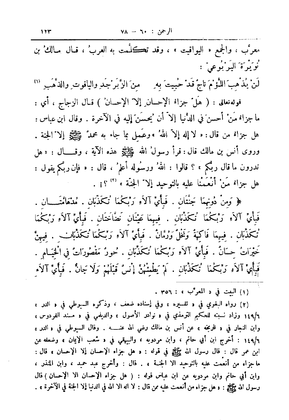 قوله تعالى هل جزاء الإحسان إلا الإحسان قال الزجاج أي ما جزاء من أحسن في الدنيا إلا ان يحسن إليه في الآخرة وقال ابن عباس هل جزاء من قال لا إله إلا الله وعمل بما جاء به محمد صلى الله عليه و سلم إلى الجنة وروى أنس بن مالك قال قرأ رسول الله صلى الله عليه و سلم هذه الآية وقال هل تدرون ما قال ربكم قالوا الله ورسوله أعلم قال فإن ربكم يقول هل جزاء من أنعمنا عليه بالتوحيد إلا الجنة