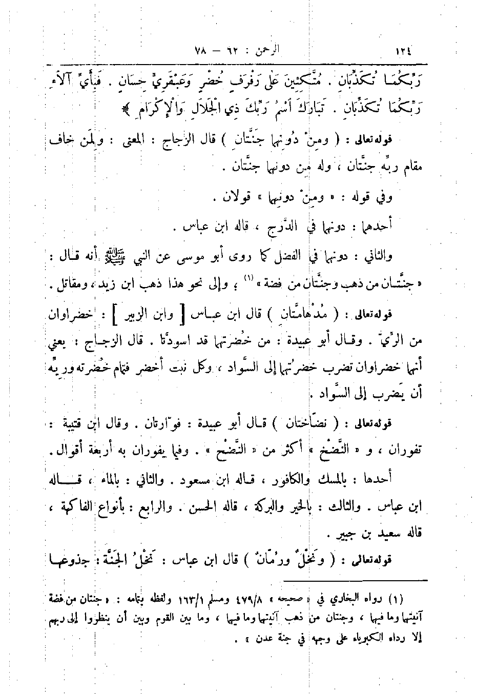 والثاني دونهما في الفضل كما روى أبو موسى عن النبي صلى الله عليه و سلم أنه قال جنتان من ذهب وجنتان من فضة وإلى نحو هذا ذهب ابن زيد ومقاتل