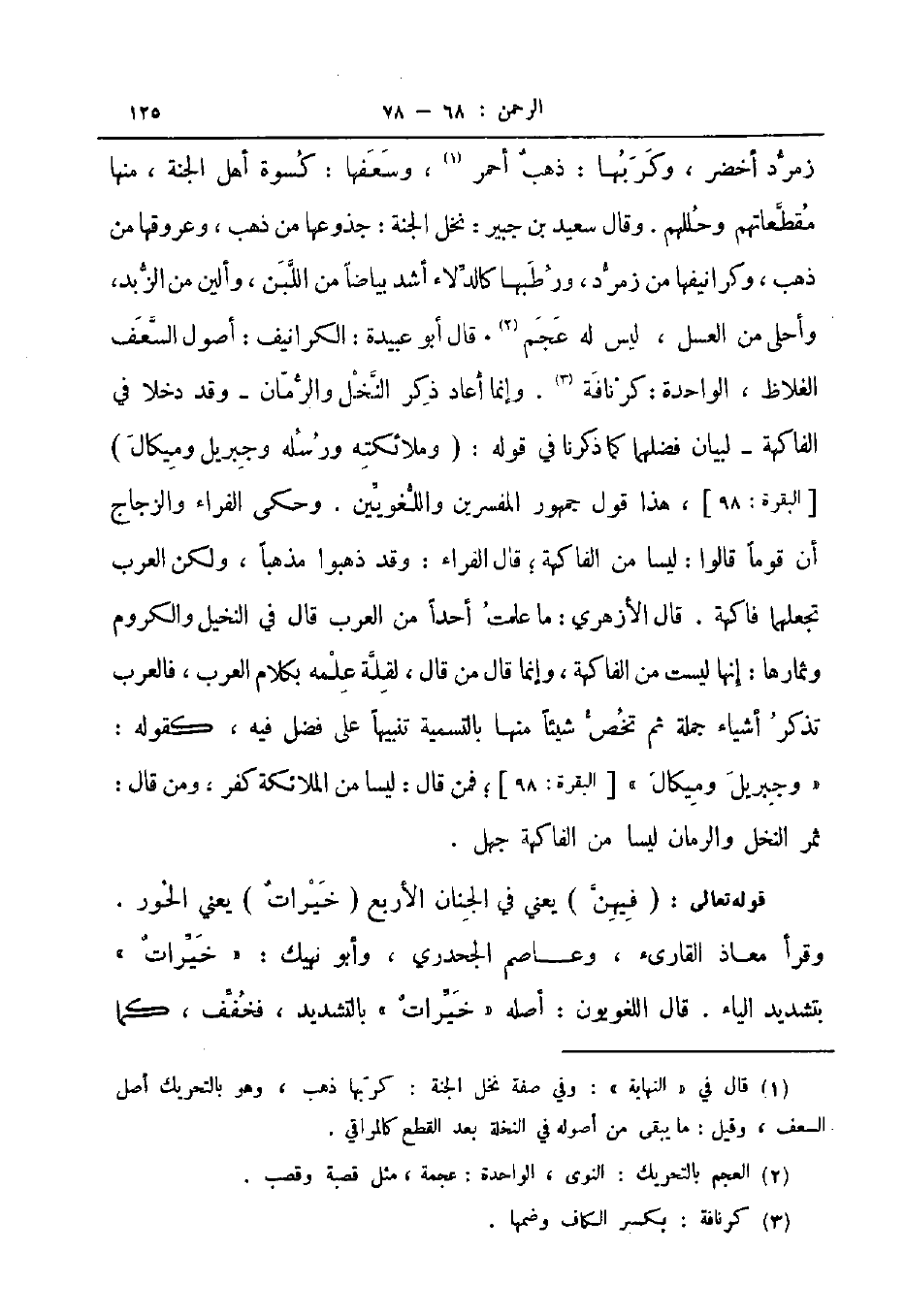 زمرد أخضر وكربها ذهب أحمر وسعفها كسوة أهل الجنة منها مقطعاتهم وحللهم وقال سعيد بن جبير نخل الجنة جذوعها من ذهب وعروقها من ذهب وكرانيفها من زمرد ورطبها كالدلاء أشد بياضا من اللبن وألين من الزبد و أحلى من العسل ليس له عجم قال أبو عبيدة الكرانيف أصول السعف الغلاظ الواحدة كرنافة وإنما أعاد ذكر النخل والرمان وقد دخلا في الفاكهة لبيان فضلهما كما ذكرنا في قوله وملائكته ورسله وجبريل وميكال البقرة 98 هذا قول جمهور المفسرين واللغويين وحكى الفراء والزجاج أن قوما قالوا ليسا من الفاكهة قال الفراء وقد ذهبوا مذهبا ولكن العرب تجعلهما فاكهة قال الأزهري ما علمت أحدا من العرب قال في النخيل والكروم وثمارها إنها ليست من الفاكهة وإنما قال من قال لقلة علمه بكلام العرب فالعرب تذكر أشياء جملة ثم تخص شيئا منها بالتسمية تنبيها على فضل فيه كقوله وجبريل وميكال البقرة 98 فمن قال ليسا من الملائكة كفر ومن قال ثمر النخل والرمان ليسا من الفاكهة جهل