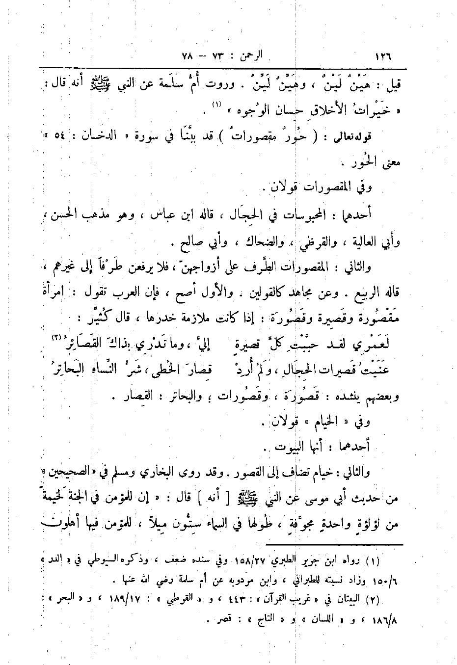 والثاني المقصورات الطرف على أزواجهن فلا يرفعن طرفا إلى غيرهم قاله الربيع وعن مجاهد كالقولين والأول أصح فإن العرب تقول امرأة مقصورة وقصيرة وقصورة إذا كانت ملازمة خدرها قال كثير ... لعمري لقد حببت كل قصيرة ... إلي وما تدري بذاك القصائر ... عنيت قصيرات الحجال ولم أرد ... قصار الخطى شر النساء البحاتر ...