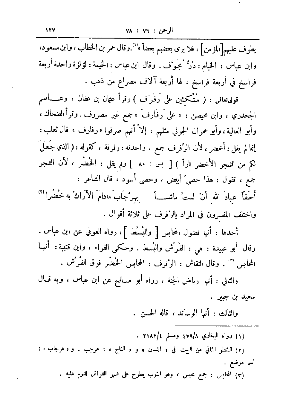 قوله تعالى متكئين على رفرف وقرأ عثمان بن عفان وعاصم الجحدري وابن محيصن على رفارف جمع غير مصروف وقرأ الضحاك وأبو العالية وأبو عمران الجوني مثلهم إلا أنهم صرفوا رفارف قال ثعلب إنما لم يقل أخضر لأن الرفرف جمع واحدته رفرفة كقوله الذي جعل لكم من الشجر الأخضر نارا يس 80 ولم يقل الخضر لأن الشجر جمع تقول هذا حصى أبيض وحصى أسود قال الشاعر ... أحقا عباد الله أن لست ماشيا ... بهرجاب ما دام الأراك به خضرا ...