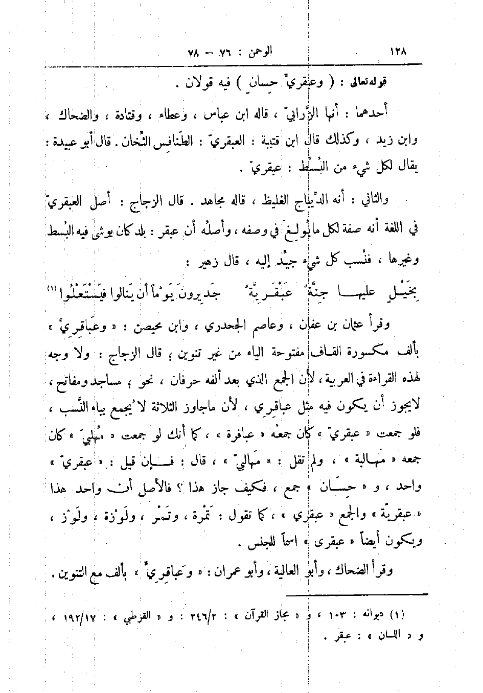 وقرأ عثمان بن عفان وعاصم الجحدري وابن محيصن وعباقري بألف مكسورة القاف مفتوحة الياء من غير تنويه قال الزجاج ولا وجه لهذه القراءة في العربية لأن الجمع الذي بعد ألفه حرفان نحو مساجد ومفاتح لا يجوز أن يكون فيه مثل عباقري لأن ما جاوز الثلاثة لا يجمع بياء النسب فلو جمعت عبقري كان جمعه عباقرة كما أنك لو جمعت مهلبي كان جمعه مهالبة ولم تقل مهالبي قال فإن قيل عبقري واحد وحسان جمع فكيف جاز هذا فالأصل أن واحد هذا عبقرية والجمع عبقري كما تقول تمرة وتمر ولوزة ولوز ويكون أيضا عبقري اسما للجنس