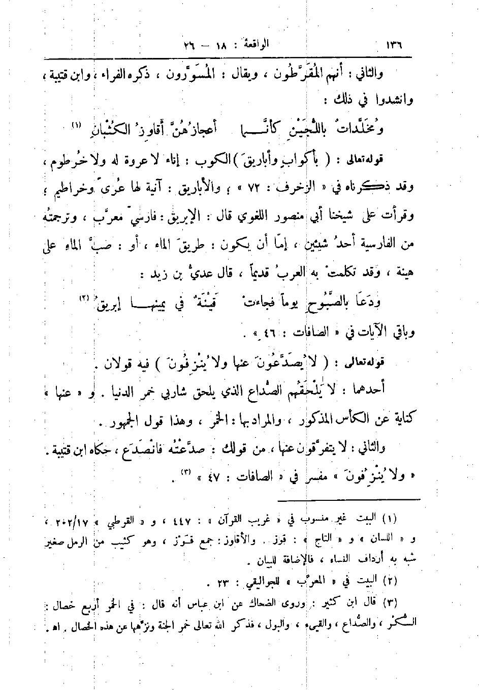 قوله تعالى بأكواب وأباريق الكوب إناء لا عروة له ولا خرطوم وقد ذكرناه في الزخرف 72 والأباريق آنية لها عرى وخراطيم وقرأت على شيخنا أبي منصور اللغوي قال الإبريق فارسي معرب وترجمته من الفارسية أحد شيئين إما أن يكون طريق الماء أو صب الماء على هينة وقد تكلمت به العرب قديما قال عدي بن زيد ... ودعا بالصبوح ويوما فجاءت ... قينة في يمينها إبريق ...