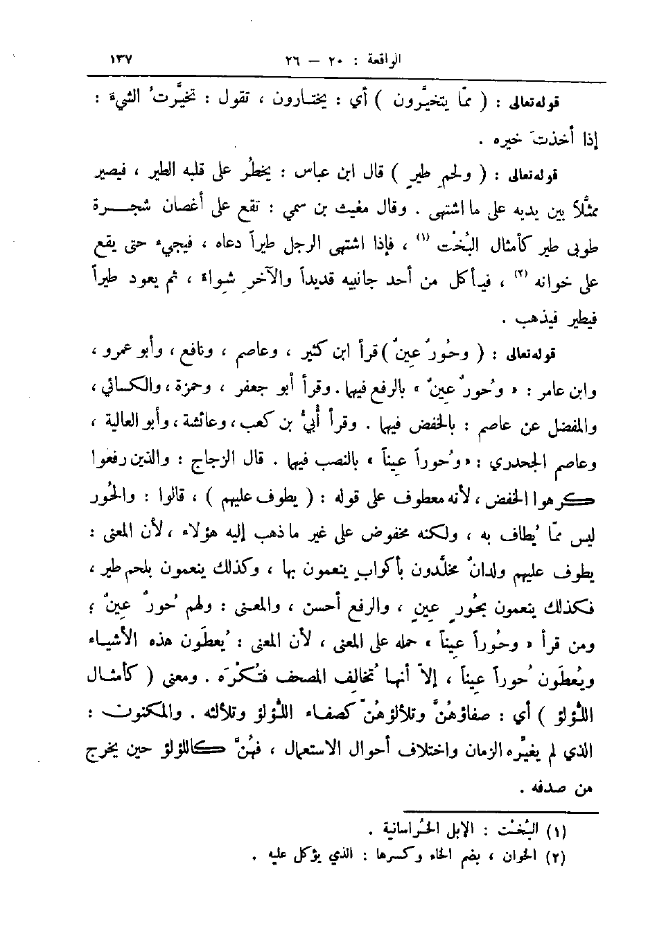 قوله تعالى ولحم طير قال ابن عباس يخطر على قلبه الطير فيصير ممثلا بين يديه على ما اشتهى وقال مغيث بن سمي تقع على أغصان شجرة طوبى طير كأمثال البخت فإذا اشتهى الرجل طيرا دعاه فيجيء حتى يقع على خوانه فيأكل من أحد جانبيه قديدا والآخر شواء ثم يعود طيرا فيطير فيذهب