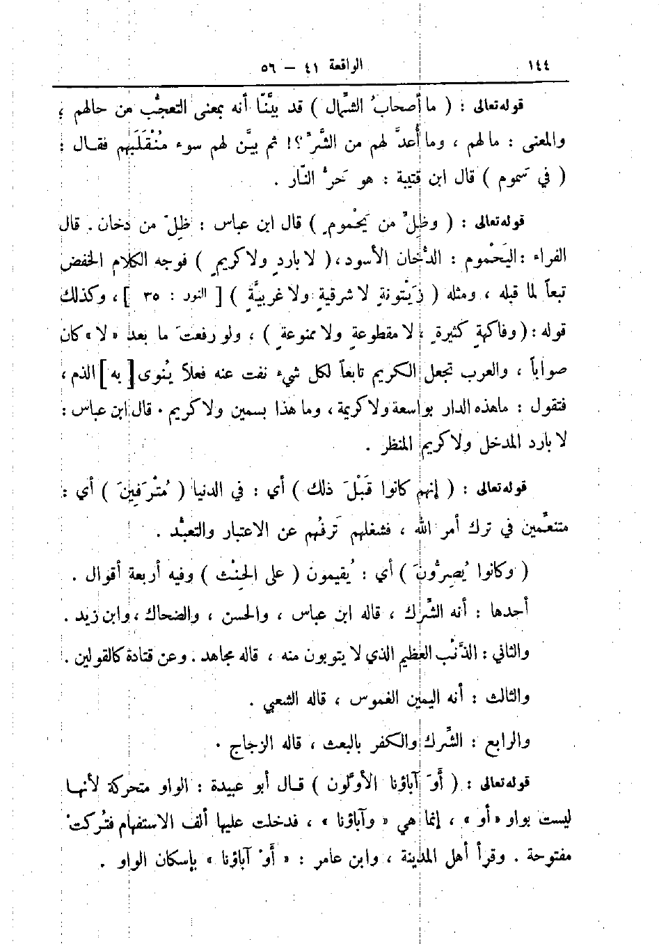 قوله تعالى وظل من يحموم قال ابن عباس ظل من دخان قال الفراء اليحموم الدخان الأسود لا بارد ولا كريم فوجه الكلام الخفض تبعا لما قبله ومثله زيتونة لا شرقية ولا غربية النور 35 وكذلك قوله وفاكهة كثيرة لا مقطوعة ولا ممنوعة ولو رفعت ما بعد لا كان صوابا والعرب تجعل الكريم تابعا لكل شيء نفت عنه فعلا ينوي به الذم فتقول ما هذه الدار بواسعة ولا كريمة وما هذا بسمين ولا كريم قال ابن عباس لا بارد المدخل ولا كريم المنظر