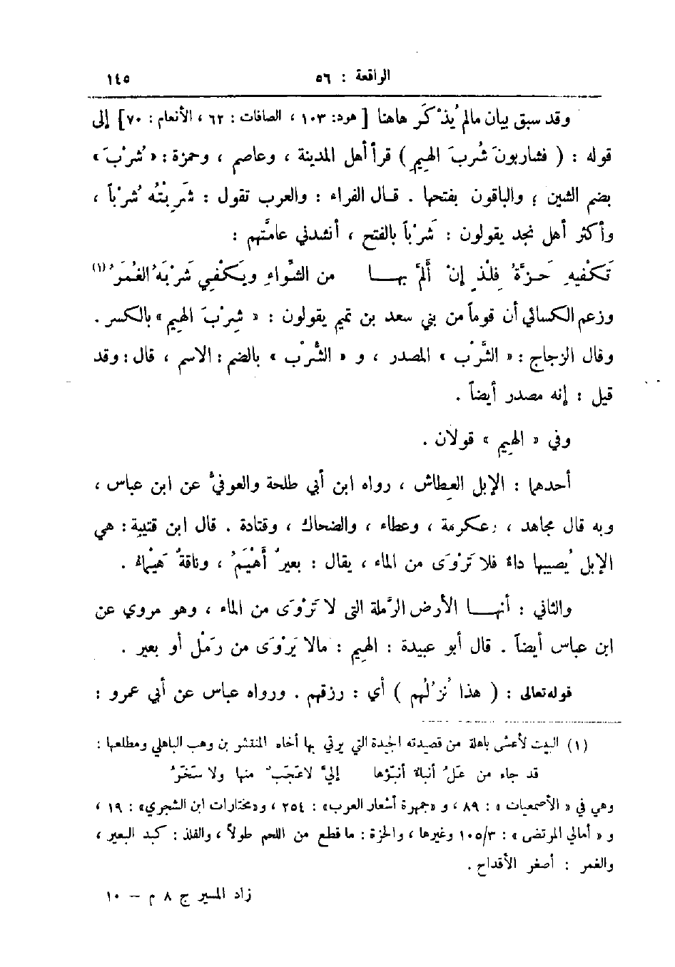 وقد سبق بيان ما لم يذكر ها هنا هود 1903 الصافات 62 الأنعام 70 إلى قوله فشاربون شرب الهيم قرأ أهل المدينة وعاصم وحمزة شرب بضم الشين والباقون بفتحها قال الفراء والعرب تقوم شربته شربا وأكثر أهل نجد يقولون شربا بالفتح أنشدني عامتهم ... تكفيه حزة فلذ إن ألم بها ... من الشواء ويكفي شربه الغمر ...