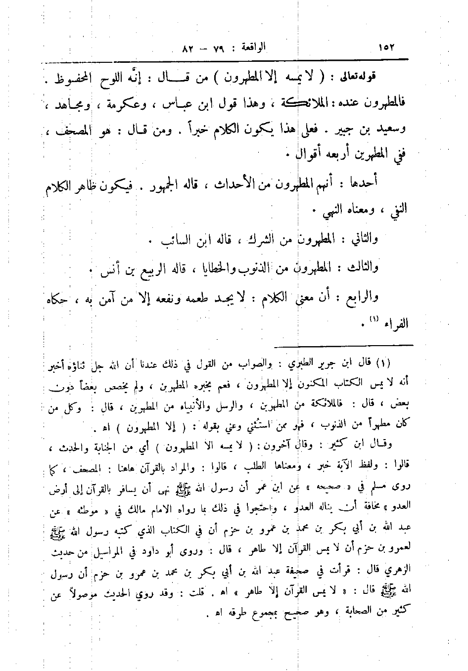 قوله تعالى لا يمسه إلا المطهرون من قال إنه اللوح المحفوظ فالمطهرون عنده الملائكة وهذا قول ابن عباس وعكرمة ومجاهد وسعيد بن جبير فعلى هذا يكون الكلام خبرا ومن قال هو المصحف ففي المطهرين أربعة أقوال