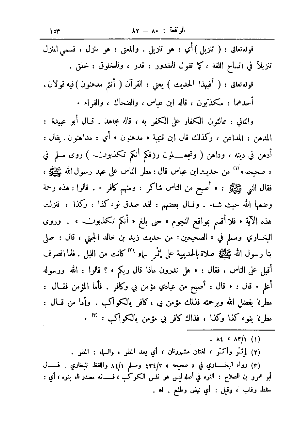 والثاني ممالئون الكفار على الكفر به قاله مجاهد قال أبو عبيدة المدهن المداهن وكذلك قال ابن قتيبة مدهنون أي مداهنون يقال أدهن في دينه وداهن وتجعلون رزقكم أنكم تكذبون روى مسلم في صحيحه من حديث ابن عباس قال مطر الناس على عهد رسول الله صلى الله عليه و سلم فقال النبي صلى الله عليه و سلم أصبح من الناس شاكر ومنهم كافر قالوا هذه رحمة وضعها الله حيث شاء وقال بعضهم لقد صدق نوء كذا وكذا فنزلت هذه الآية فلا أقسم بمواقع النجوم حتى بلغ أنكم تكذبون وروى البخاري ومسلم في الصحيحين من حديث زيد بن خالد الجهني قال صلى بنا رسول الله صلى الله عليه و سلم صلاة بالحديبية على إثر سماء كانت من الليل فلما انصرف أقبل على الناس فقال هل تدرون ماذا قال ربكم قالوا الله ورسوله أعلم قال قال أصبح من عبادي مؤمن بي وكافر فأما المؤمن فقال مطرنا بفضل الله وبرحمته فذلك مؤمن بي كافر بالكواكب وأما من قال مطرنا بنوء كذا وكذا فذاك كافر بي مؤمن بالكواكب