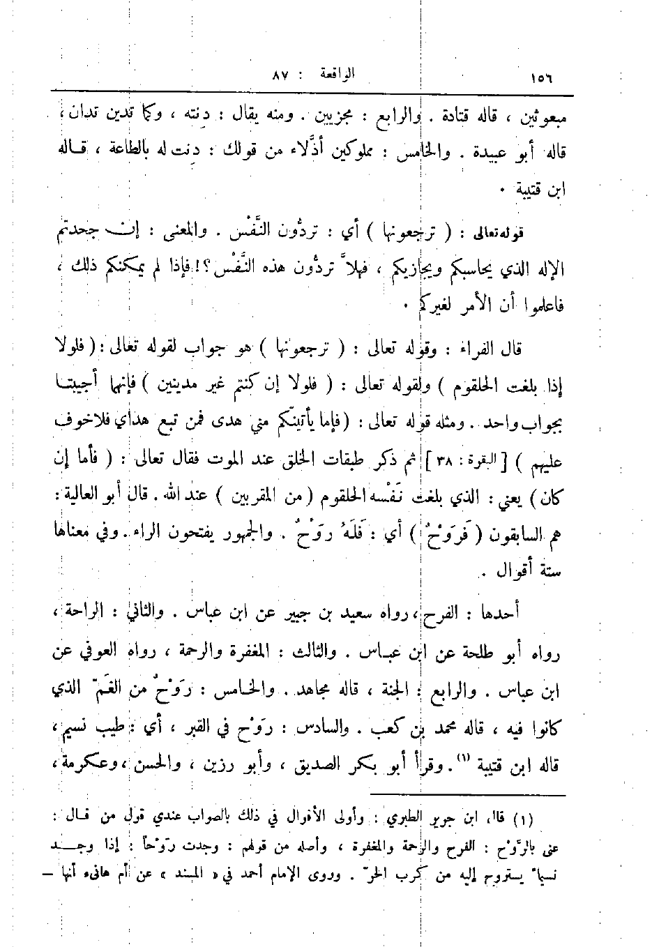 قال الفراء وقوله تعالى ترجعونا هو جواب لقوله تعالى فلولا إذا بلغت الحلقوم ولقوله تعالى فلولا إن كنتم غير مدينين فإنهما أجيبتا بجواب واحد ومثله قوله تعالى فإما يأتينكم مني هدى فمن تبع هداي فلا خوف عليهم البقرة 38 ثم ذكر طبقات الخلق عند الموت فقال تعالى فأما إن كان يعني الذي بلغت نفسه الحلقوم من المقربين عند الله قال أبو العالية هم السابقون فروح أي فله روح والجمهور يفتحون الراء وفي معناها ستة أقوال