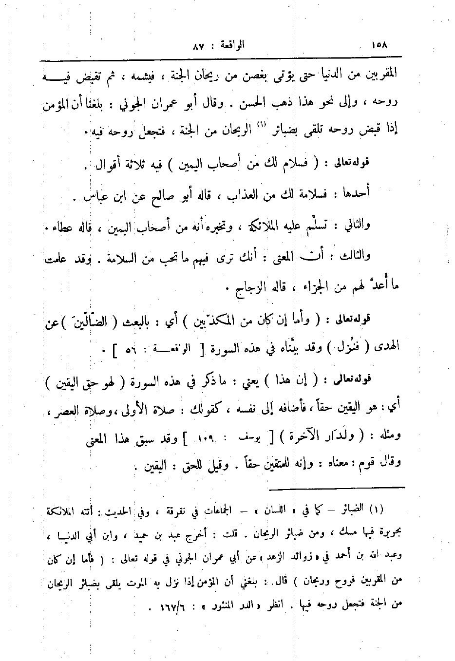 المقربين من الدنيا حتى يؤتى بغصن من ريحان الجنة فيشمه ثم تقبض فيه روحه وإلى نحو هذا ذهب الحسن وقال أبو عمران الجوني بلغنا أن المؤمن إذا قبض روحه تلقى بضبائر الريحان من الجنة فتجعل روحه فيه