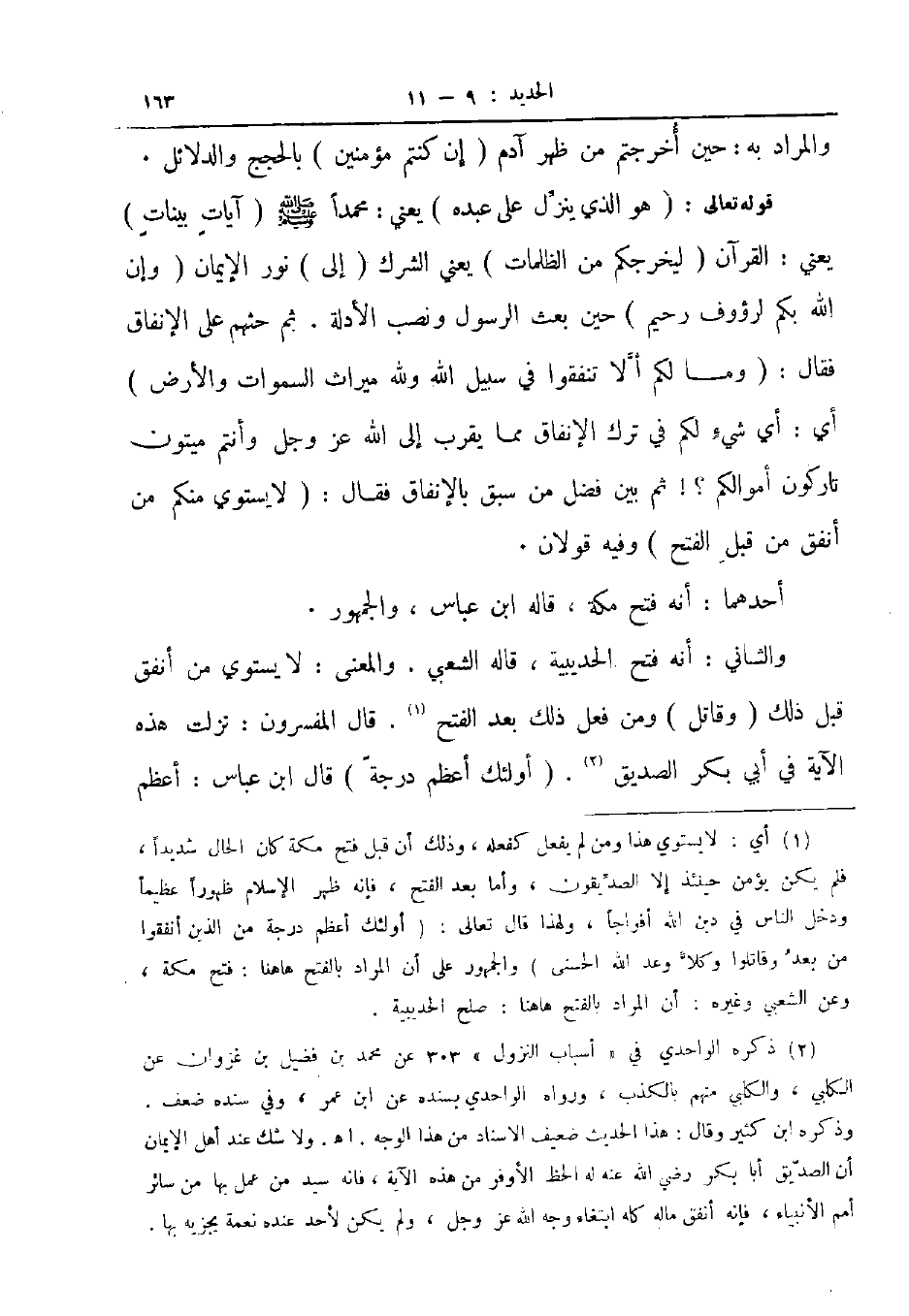 قوله تعالى هو الذي ينزل على عبده يعني محمدا صلى الله عليه و سلم آيات بينات يعني القرآن ليخرجكم من الظلمات يعني الشرك إلى نور الإيمان وإن الله بكم لرؤوف رحيم حين بعث الرسول ونصب الأدلة ثم حثهم على الإنفاق فقال وما لكم ألا تنفقوا في سبيل الله ولله ميراث السموات و الأرض أي أي شيء لكم في ترك الإنفاق مما يقرب إلى الله عز و جل وأنتم ميتون تاركون أموالكم ثم بين فضل من سبق بالإنفاق فقال لا يستوي منكم من أنفق من قبل الفتح وفيه قولان