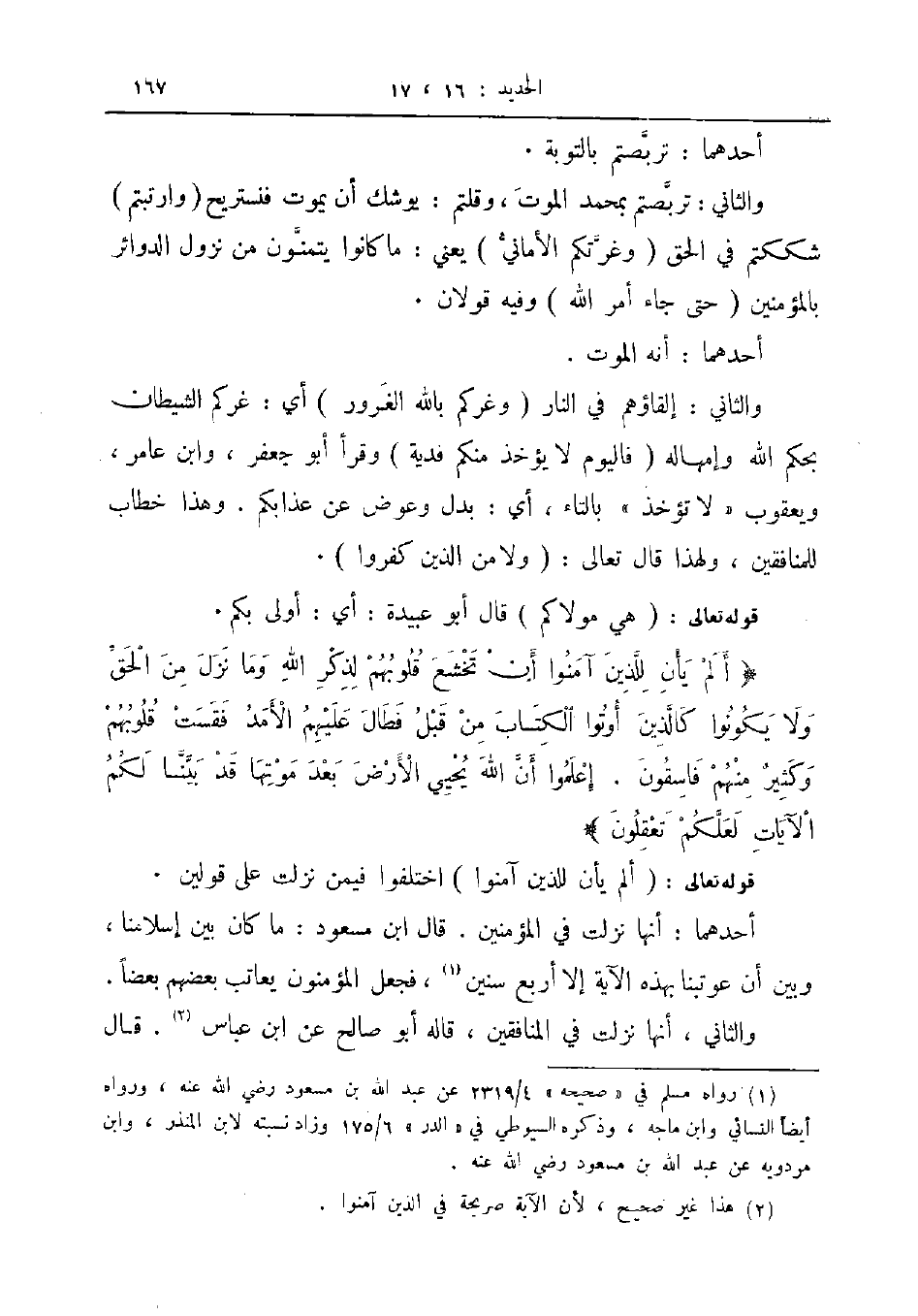 أحدهم أنها نزلت في المؤمنين قال ابن مسعود ما كان بين إسلامنا وبين أن عوتبنا بهذه الآية إلا أربع سنين فجعل المؤمنون يعاتب بعضهم بعضا