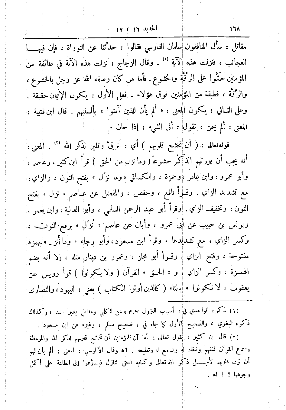 قوله تعالى أن تخشع قلوبهم أي ترق وتلين لذكر الله المعنى أنه يجب أن يورثهم الذكر خشوعا وما نزل من الحق قرأ ابن كثير وعاصم وأبو عمرو وابن عامر وحمزة والكسائي وما نزل بفتح النون والزاي مع تشديد الزاي وقرأ نافع وحفص والمفضل عن عاصم نزل بفتح النون وتخفيف الزاي وقرأ أبو عبد الرحمن السلمي وأبو العالية وابن يعمر ويونس بن حبيب عن أبي عمرو وأبان عن عاصم نزل برفع النون وكسر الزاي مع تشديدها وقرأ ابن مسعود وأبو رجاء وما أنزل بهمزة مفتوحة وفتح الزاي وقرأ أبو مجلز وعمرو بن دينار مثله إلا أنه بضم الهمزة وكسر الزاي والحق القرآن ولا يكونوا قرأ رويس عن يعقوب لا تكونوا بالتاء كالذين أوتوا الكتاب يعني اليهود والنصارى