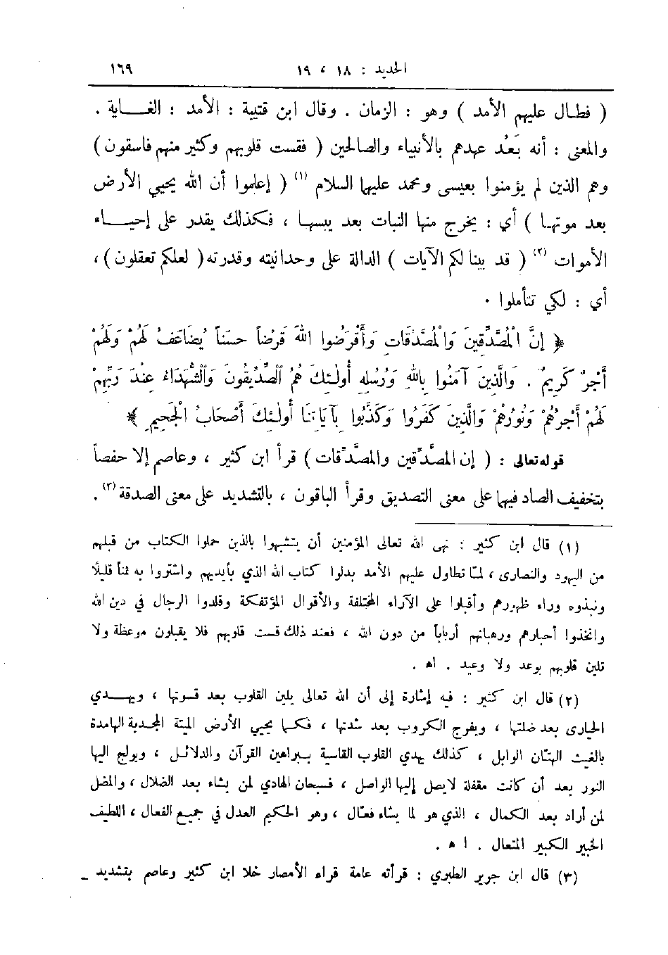 فطال عليهم الأمد وهو الزمان وقال ابن قتيبة الأمد الغاية والمعنى أنه بعد عهدهم بالأنبياء والصالحين فقست قلبوهم وكثير منهم فاسقون وهم الذين لم يؤمنوا بعيسى ومحمد عليهما السلام إعلموا أن الله يحيي الأرض بعد موتها أي يخرج منها النبات بعد يبسها فكذلك يقدر على إحياء الأموات قد بينا لكم الآيات الدالة على وحدانيته وقدرته لعلكم تعقلون أي لكي تتأملوا إن المصدقين والمصدقات وأقرضوا الله قرضا حسنا يضاعف لهم ولهم أجر كريم والذين آمنوا بالله ورسله أولئك هم الصديقون والشهداء عند ربهم لهم أجرهم ونورهم والذين كفروا وكذبوا بآياتنا أولئك أصحاب الجحيم