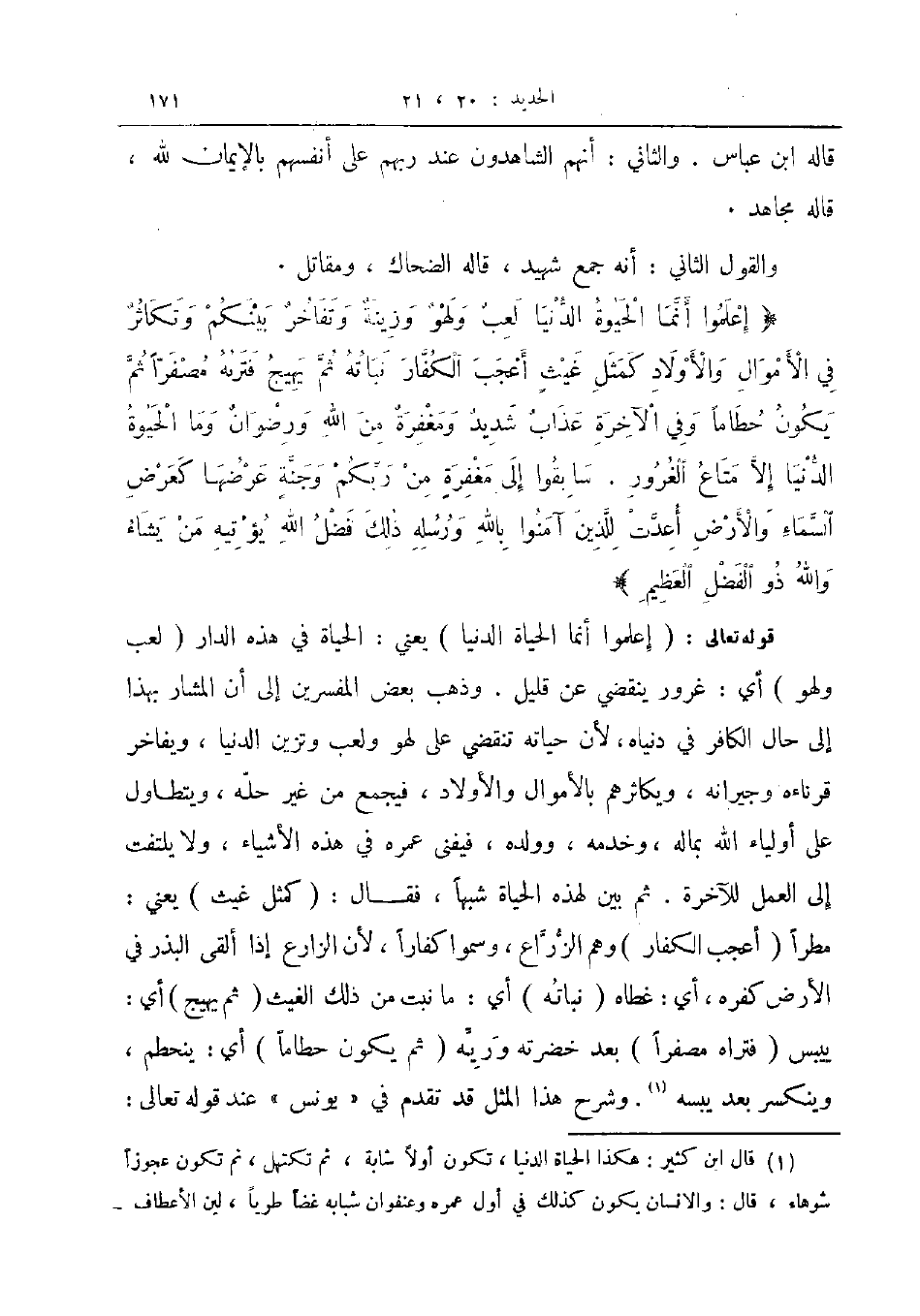 إعلموا أنما الحيوة الدنيا لعب ولهو وزينة وتفاخر بينكم وتكاثر في الأموال والأولاد كمثل غيث أعجب الكفار نباته ثم يهيج فتراه مصفرا ثم يكون حطاما وفي الآخرة عذاب شديد ومغفرة من الله ورضوان وما الحيوة الدنيا إلا متاع الغرور سابقوا إلى مغفرة من ربكم وجنة عرضها كعرض السماء والأرض أعدت للذين آمنوا بالله ورسله ذلك فضل الله يؤتيه من يشاء والله ذو الفضل العظيم