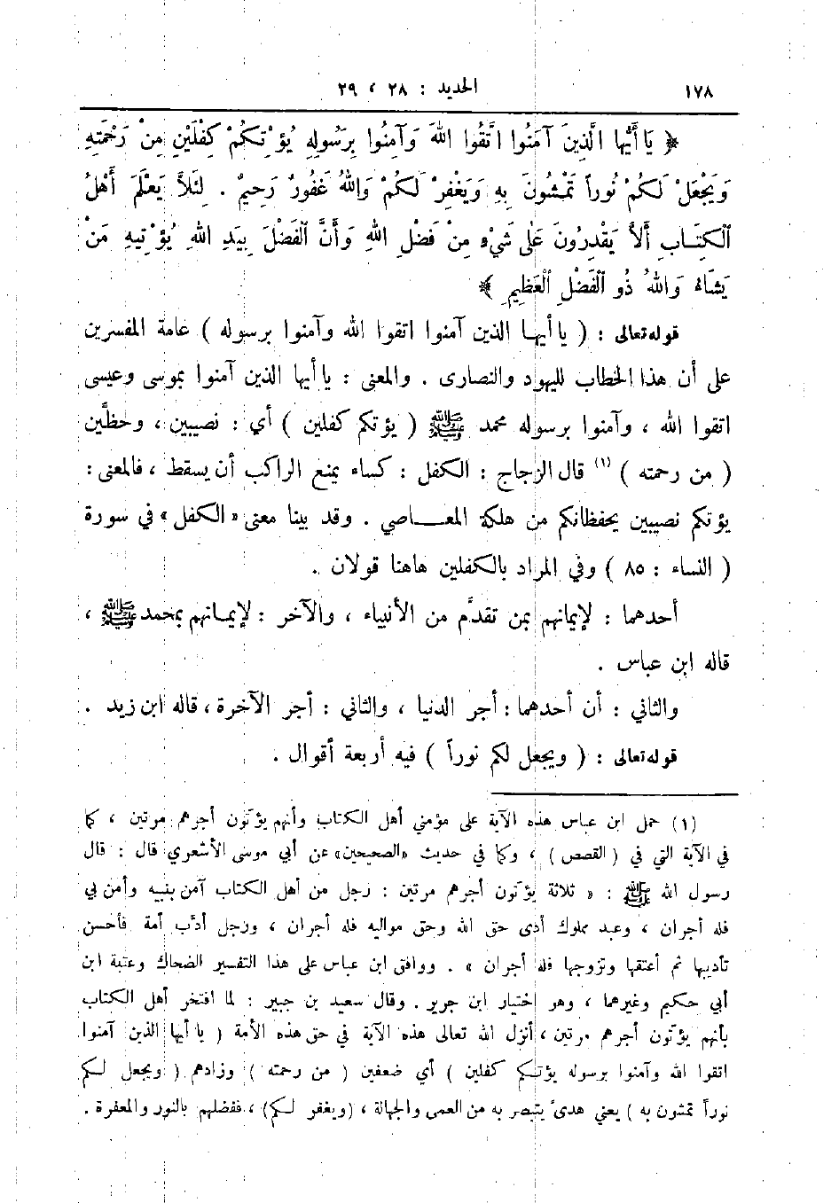 يا أيها الذين آمنوا اتقوا الله وآمنوا برسوله يؤتكم كفلين من رحمته ويجعل لكم نورا تمشون به ويغفر لكم والله غفور رحيم لئلا يعلم أهل الكتاب ألا يقدرون على شيء من فضل الله وأن الفضل بيد الله يؤتيه من يشاء والله ذو الفضل العظيم
