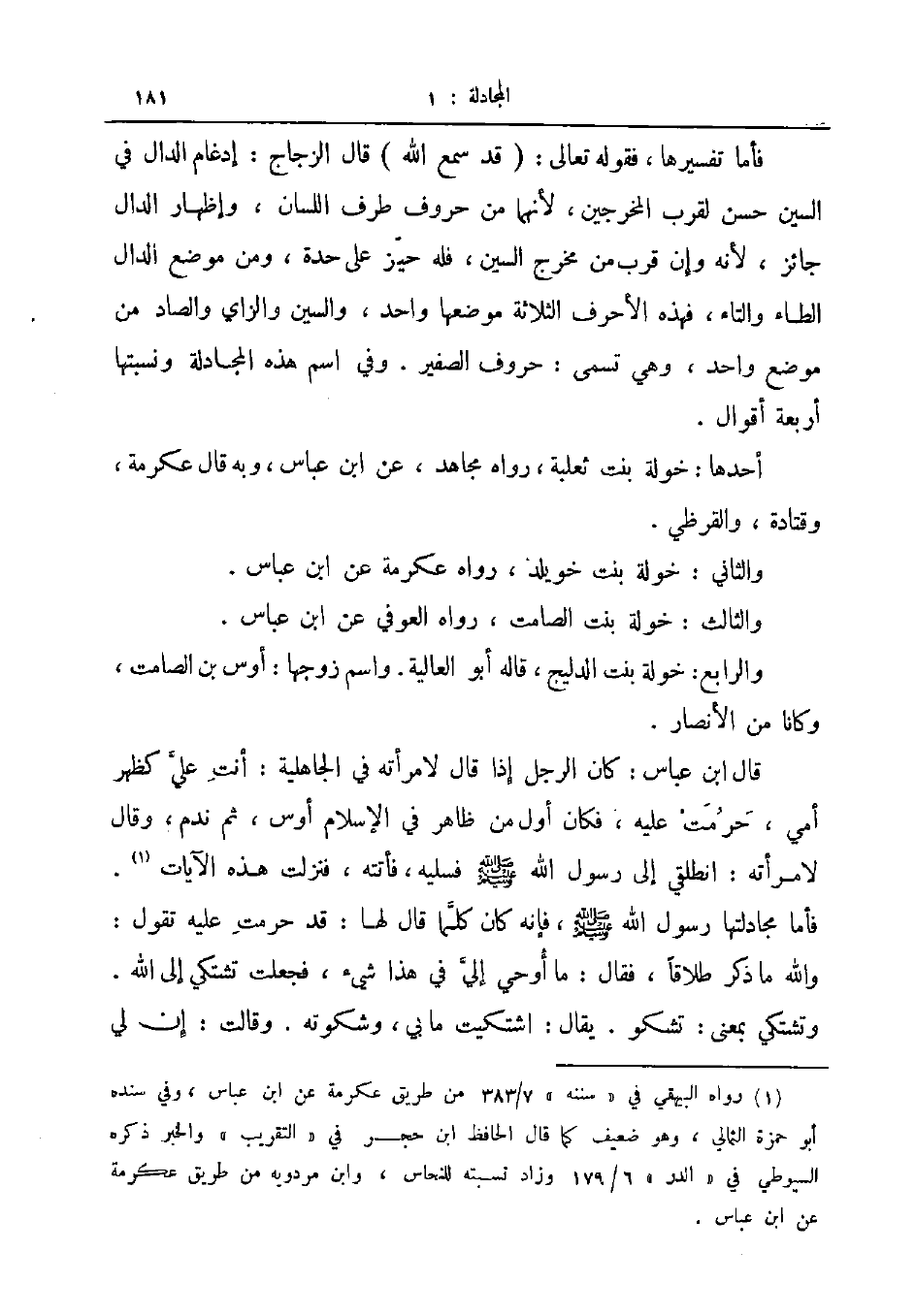 فأما تفسيرها فقوله تعالى قد سمع الله قال الزجاج إدغام الدال في السين حسن لقرب المخرجين لأنهما من حروف طرف اللسان وإظهار الدال جائز لأنه وإن قرب من مخرج السين فله حيز على حدة ومن موضع الدال الطاء والتاء فهذه الأحرف الثلاثة موضعها واحد والسين والزاي والصاد من موضع واحد وهي تسمى حروف الصغير وفي اسم هذه المجادلة ونسبتها أربعة أقوال