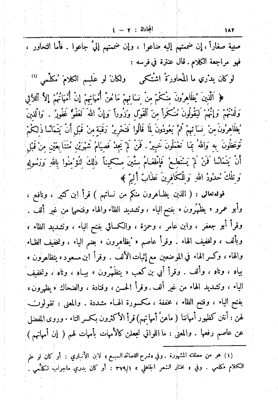 قوله تعالى الذين يظاهرون منكم من نسائهم قرأ ابن كثير ونافع وأبو عمرو يظهرون بفتح الياء وتشديد الظاء والهاء وفتحهما من غير ألف وقرأ أبو جعفر وابن عامر وحمزة والكسائي بفتح الياء وتشديد الظاء وبألف وتخفيف الهاء وقرأ عاصم يظاهرون بضم الياء وتخفيف الظاء والهاء وكسر الهاء في الموضعين مع إثبات الألف وقرأ ابن مسعود يتظاهرون بياء وتاء وألف وقرأ أبي بن كعب يتظهرون بياء وتاء وتخفيف الياء وتشديد الهاء من غير ألف وقرأ الحسن وقتادة والضحاك يظهرون بفتح الياء وفتح الظاء مخففة مكسورة الهاء مشددة والمعنى تقولون لهن أنتن كظهور أمهاتنا ما هن أمهاتهم قرأ الأكثرون بكسر التاء وروى المفضل عن عاصم رفعها والمعنى ما اللواتي تجعلن كالأمهات بأمهات له إن أمهاتهم