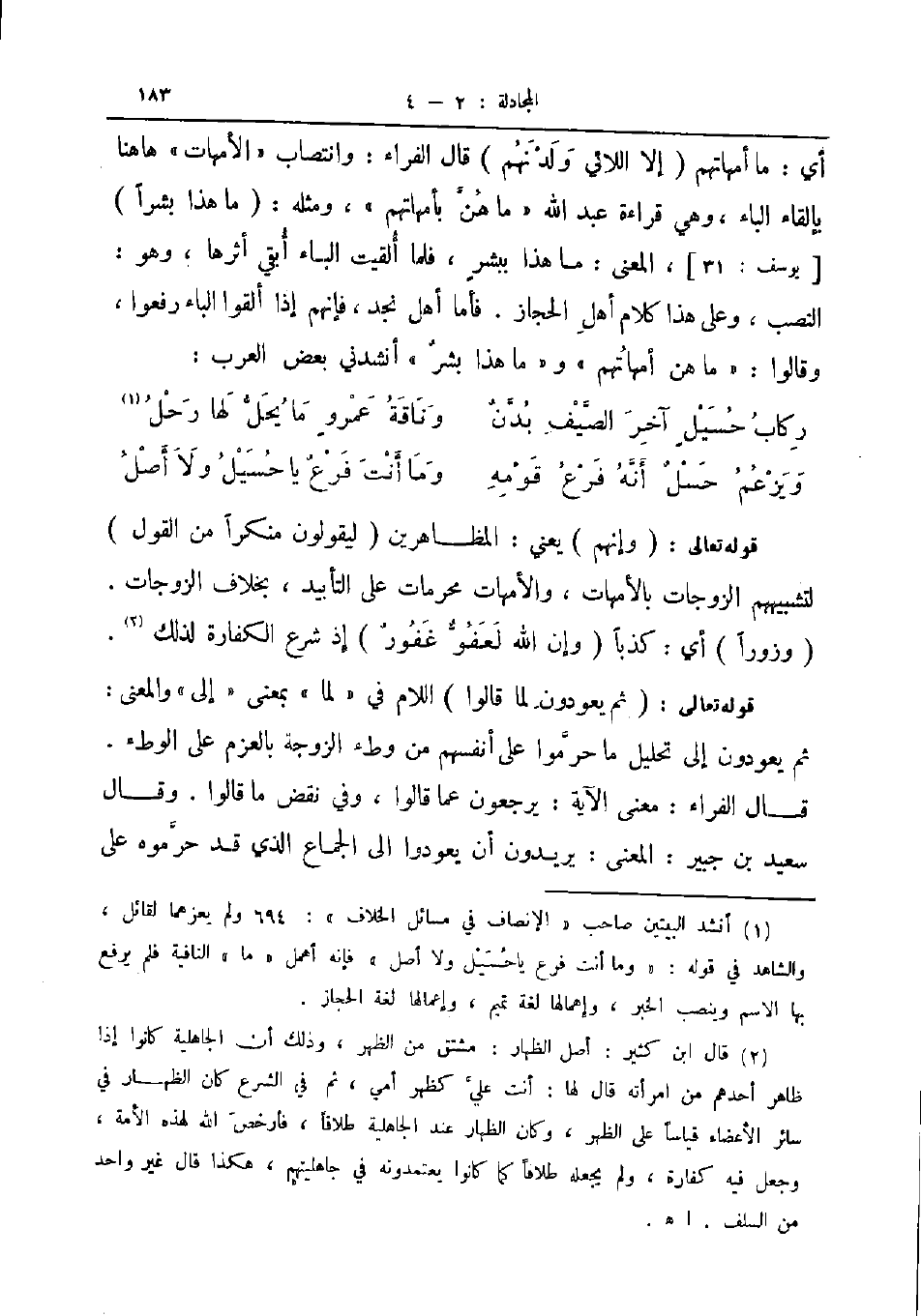 أي ما أمهاتهم إلا اللائي ولدنهم قال الفراء وانتصاب الأمهات ها هنا بإلقاء الباء وهي قراءة عبد الله ما هن بأمهاتهم ومثله ما هذا بشرا يوسف 31 المعنى ما هذا ببشر فلما ألقيت الباء أبقي أثرها وهو النصب وعلى هذا كلام أهل الحجاز فأما أهل نجد فإنهم إذا ألقوا الباء رفعوا وقالوا ما هن أمهاتهم وما هذا بشر أنشدني بعض العرب ... ركاب حسيل آخر الصيف بدن ... وناقة عمرو ما يحل لها رحل ... ويزعم حسل أنه فرع قومه ... وما أنت فرع يا حسيل ولا أصل ...