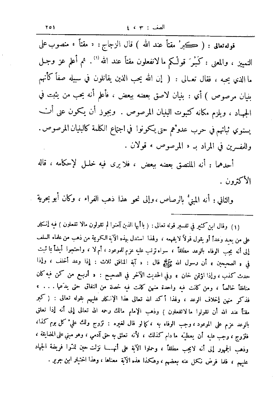 قول تعالى كبر مقتا عند الله قال الزجاج مقتا منصوب على التمييز والمعنى كبر قولكم ما لا تفعلون مقتا عند الله ثم أعلم عز و جل ما الذي يحبه فقال تعالى إن الله يحب الذين يقاتلون في سبيله صفا كأنهم بنيان مرصوص أي بنيان لاصق بعضه ببعض فأعلم أنه يحب من يثبت في الجهاد ويلزم مكانه كثبوت البنيان المرصوص ويجوز أن يكون عنى أن يستوي ثباتهم في حرب عدوهم حتى يكونوا في اجتماع الكلمة كالبنيان المرصوص وللمفسرين في المراد ب المرصوص قولان
