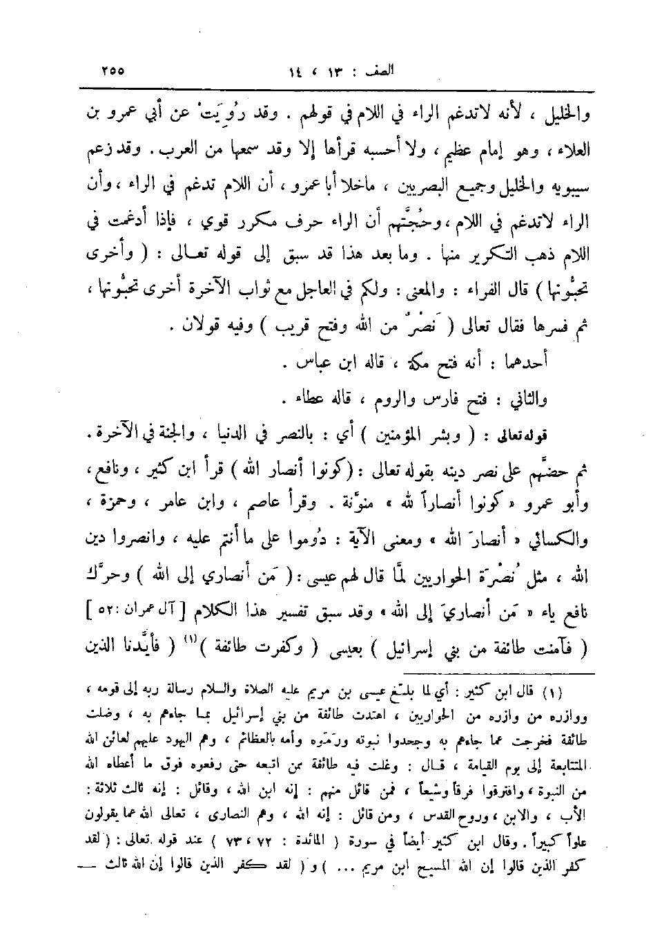 والخليل لأنه لا تدغم الراء في اللام في قولهم وقد رويت عن ابي عمرو بن العلاء وهو إمام عظيم ولا أحسبه قرأها إلا وقد سمعها من العرب وقد زعم سيبويه والخليل وجميع البصريين ما خلا أبا عمرو أن اللام تدغم في الراء وأن الراء لا تدغم في اللام وحجتهم أن الراء حرف مكرر قوي فإذا أدغمت في اللام ذهب التكرير منها وما بعد هذا قد سبق إلى قوله تعالى وأخرى تحبونها قال الفراء والمعنى ولكم في العاجل مع ثواب الآخرة أخرى تحبونها ثم فسرها فقال تعالى نصر من الله وفتح قريب وفيه قولان