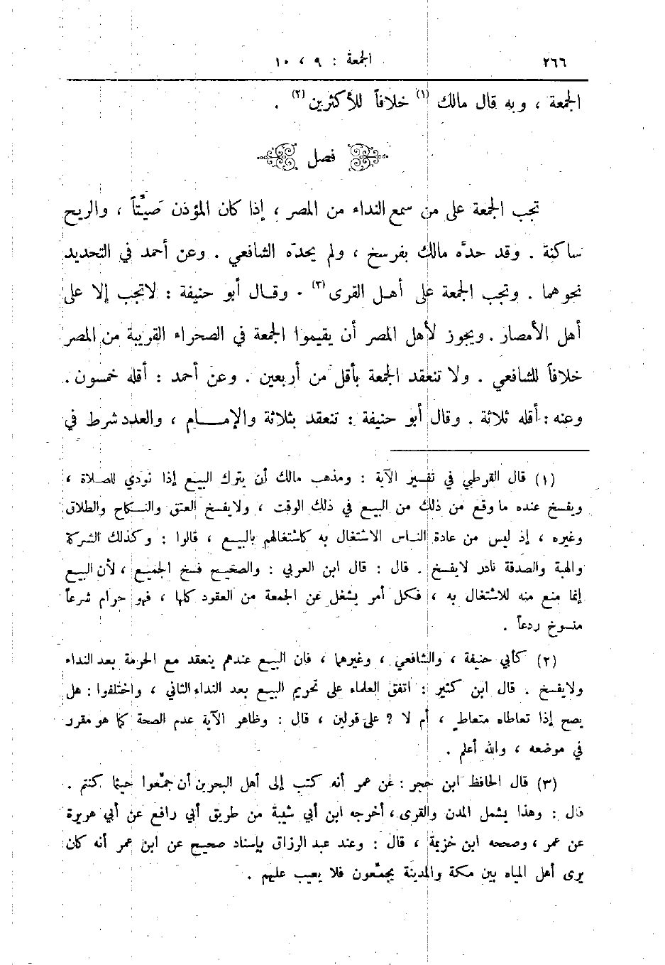 تجب الجمعة على من سمع النداء من المصر إذا كان المؤذن صيتا والريح سانكة وقد حده مالك بفرسخ ولم يحده الشافعي وعن أحمد في التحديد نحوهما وتجب الجمعة على أهل القرى وقال أبو حنيفة لا تجب إلا على أهل الأمصار ويجوز لأهل المصر أن يقيموا الجمعة في الصحراء القريبة من المصر خلافا للشافعي ولا تنعقد الجمعة بأقل من أربعين وعن أحمد أقله خمسون وعنه أقله ثلاثة وقال أبو حنيفة تنعقد بثلاثة والإمام والعدد شرط في