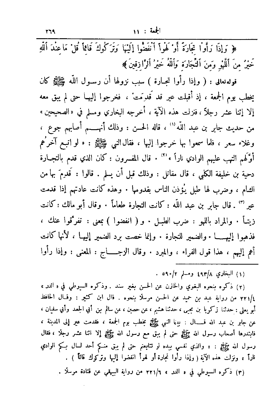 قوله تعالى وإذا رأوا تجارة سبب نزولها أن رسول الله صلى الله عليه و سلم كان يخطب يوم الجمعة إذ أقبلت عير قد قدمت فخرجوا إليها حتى لم يبق معه إلا إثنا عشر رجلا فنزلت هذه الآية أخرجه البخاري ومسلم في الصحيحين من حديث جابر بن عبد الله قاله الحسن وذلك أنهم أصابهم جوع وغلاء سعر فلما سمعوا بها خرجوا إليها فقال النبي صلى الله عليه و سلم لو اتبع آخرهم أولهم التهب عليهم الوادي نارا قال المفسرون كان الذي قدم بالتجارة دحية بن خليفة الكلبي قال مقاتل وذلك قبل أن يسلم قالوا قدم بها من الشام وضرب لها طبل يؤذن الناس بقدومها وهذه كانت عادتهم إذا قدمت عير قال جابر بن عبد الله كانت التجارة طعاما وقال أبو مالك كانت زيتا والمراد باللهو ضرب الطبل وانفضوا بمعنى تفرقوا عنك فذهبوا إليها والضمير للتجارة وإنما خصت برد الضمير إليها لأنها كانت أهم إليهم هذا قول الفراء والمبرد وقال الزجاج المعنى وإذا رأوا