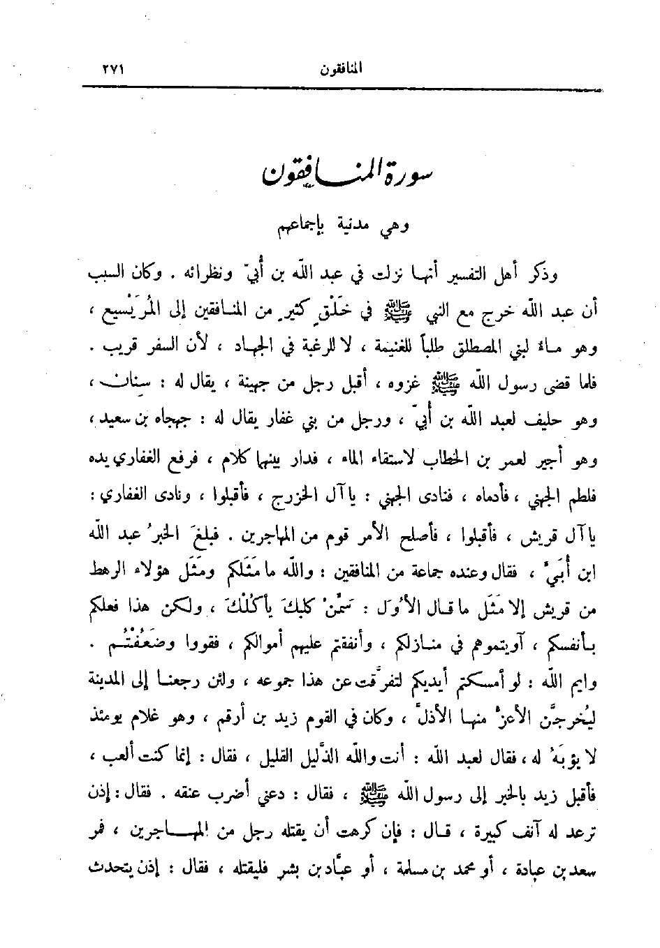 وذكر أهل التفسير أنها نزلت في عبد الله بن أبي ونظرائه وكان السبب أن عبد الله خرج مع النبي صلى الله عليه و سلم في خلق كثير من المنافقين إلى المريسيع وهو ماء لبني المصطلق طلبا للغنيمة لا للرغبة في الجهاد لأن السفر قريب فلما قضى رسول الله صلى الله عليه و سلم غزوه أقبل رجل من جهينة يقال له سنان وهو حليف لعبد الله بن أبي ورجل من بني غفار يقال له جهجاه بن سعيد وهو أجير لعمر بن الخطاب لاستقاء الماء فدار بينهما كلام فرفع الغفاري يده فلطم الجهني فأدماه فنادى الجهني يا آل الخزرج فأقبلوا ونادى الغفاري يا آل قريش فأقبلوا فأصلح الأمر قوم من المهاجرين فبلغ الخبر عبد الله ابن أبي فقال وعنده جماعة من المنافقين والله ما مثلكم ومثل هؤلاء الرهط من قريش إلا مثل ما قال الأول سمن كلبك يأكلك ولكن هذا فعلكم بأنفسكم آويتموهم في منازلكم وأنفقتم عليهم أموالكم فقووا وضعفتم وايم الله لو أمسكتم أيديكم لتفرقت عن هذا جموعه ولئن ردجعنا إلى المدينة ليخرجن الأعز منها الأذل وكان في القوم زيد بن أرقم وهو غلام يومئذ لا يؤبه له فقال لعبد الله أنت والله الذليل القليل فقال إنما كنت ألعب فأقبل زيد بالخبر إلى رسول الله صلى الله عليه و سلم فقال دعني أضرب عنقه فقال إذن ترعد له آنف كبيرة قال فإن كرهت أن يقتله رجل من المهاجرين فمر سعد بن عبادة أو محمد بن مسلمة أو عباد بن بشر فليقتله فقال إذن يتحدث