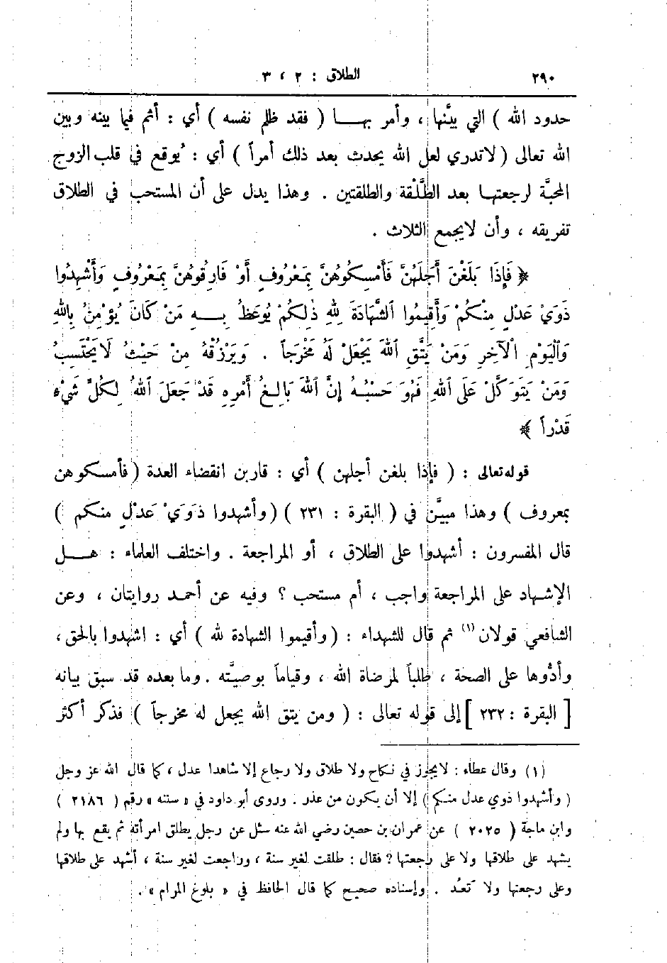 قوله تعالى فإذا بلغن أجلهن أي قاربن انقضاء العدة فأمسكوهن بمعروف وهذا مبين في البقرة 231 وأشهدوا ذوي عدل منكم قال المفسرون أشهدوا على الطلاق أو المراجعة واختلف العلماء هل الإشهاد على المراجعة واجب أم مستحب وفيه عن أحمد روايتان وعن الشافعي قولان ثم قال للشهداء وأقيموا الشهادة لله أي اشهدوا بالحق وأدوها على الصحة طلبا لمرضاة الله وقياما بوصيته وما بعده قد سبق بيانه البقرة 232 إلى قوله تعالى ومن يتق الله يجعل له مخرجا فذكر أكثر