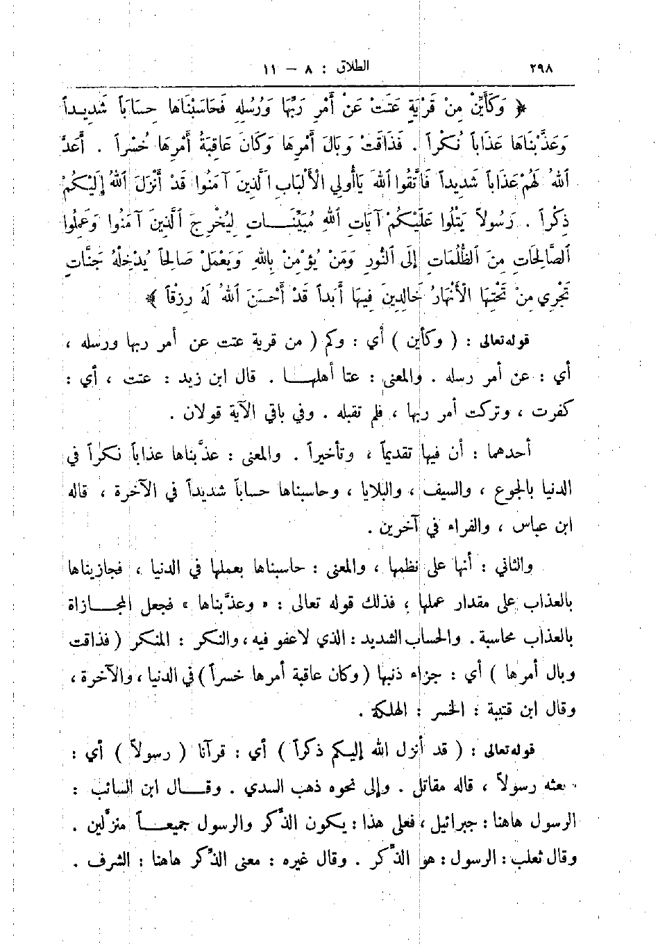 وكأين من قرية عتت عن أمر ربها ورسله فحاسبناها حسابا شديدا وعذبناها عذاب نكرا فذاقت وبال أمرها وكان عاقبة أمرها خسرا أعد الله لهم عذابا شديدا فاتقوا الله يا أولي الألباب الذين آمنوا قد أنزل الله إليكم ذكرا رسولا يتلوا عليكم آيات الله مبينات ليخرج الذين آمنوا وعملوا الصالحات من الظلمات إلى النور ومن يؤمن بالله ويعمل صالحا يدخله جنات تجري من تحتها الأنهار خالدين فيها أبدا قد أحسن الله له رزقا