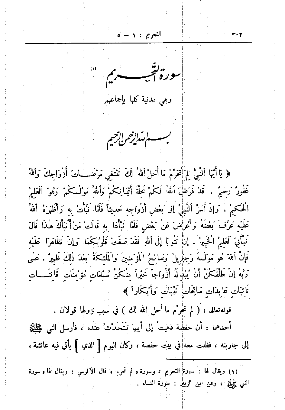 يا أيها النبي لم تحرم ما أحل الله لك تبتغي مرضات أزواجك والله غفور رحيم قد فرض الله لكم تحلة أيمانكم والله مولكم وهو العليم الحكيم وإذ أسر النبي إلى بعض أزواجه حديثا فلما نبأت به وأظهره الله عليه عرف بعضه وأعرض عن بعض فلما نبأها به قالت من أنبأك هذا قال نبأني العليم الخبير إن تتوبا إلى الله فقد صغت قلوبكما وإن تظاهرا عليه فإن الله هو موله وجبريل وصالح المؤمنين والملائكة بعد ذلك ظهير عسى ربه إن طلقكن أن يبدله أزواجا خيرا منكن مسلمات مؤمنات قانتات تائبات عابدات سائحات ثيبات وأبكارا