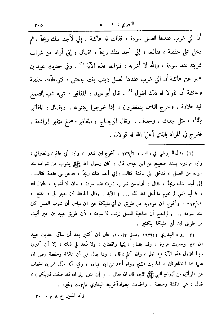 أن التي شرب عندها العسل سودة فقالت له عائشة إني لأجد منك ريحا ثم دخل على حفصة فقالت إني أجد منك ريحا فقال إني أراه من شراب شربته عند سودة والله لا أشربه فنزلت هذه الآية وفي حديث عبيد بن عمير عن عائشة ان التي شرب عندها العسل زيتب بنت جحش فتواطأت حفصة وعائشة أن تقولا له ذلك القول قال أبو عبيد المغافير شيء شبيه بالصمغ فيه حلاوة وخرج الناس يتمغفرون إذا خرجوا يجتنونه ويقال المغاثير بالثاء مثل جدث وجدف وقال الزجاج المغافير صمغ متغير الرائحة فخرج في المراد بالذي أحل الله له قولان