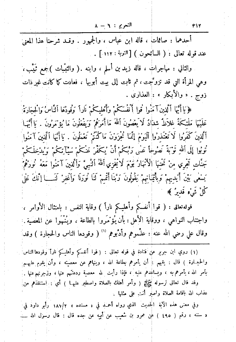 قوله تعالى قوا أنفسكم وأهليكم نارا وقاية النفس بامتثال الأوامر واجتاب النواهي ووقاية الأهل بأن يؤمروا بالطاعة وينهوا عن المعصية وقال علي رضي الله عنه علموهم وأدبوهم وقودها الناس والحجارة وقد