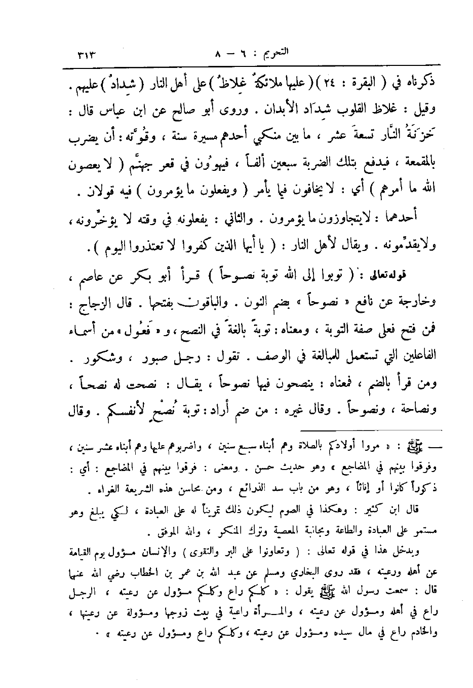 قوله تعالى توبوا إلى الله توبة نصوحا قرأ أبو بكر عن عاصم وخارجة عن نافع نصوحا بضم النون والبقاون بفتحها قال الزجاج فمن فتح فعلى صفة التوبة ومعناه توبة بالغة في النصح وفعول من أسماء الفاعلين التي تستعمل للمبالغة في الوصف تقول رجل صبور وشكور ومن قرأ بالضم فمعناه ينصحون فيها نصوحا يقال نصحت له نصحا ونصاحة ونصوحا وقال غيره من ضم أراد توبة نصح لأنفسكم وقال