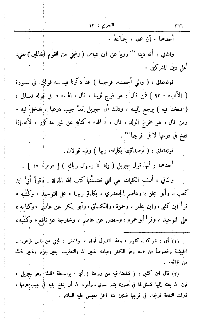 قوله تعالى والتي أحصنت فرجها قد ذكرنا فيه قولين في سورة الأنبياء 92 فمن قال هو فرج ثوبها قال الهاء في قوله تعالى فنفخنا فيه يرجع إليه وذلك أن جبريل مد جيب درعها فدخل فيه ومن قال هو مخرج الولد قال الهاء كناية عن غير مذكور لأنه إنما نفخ في درعها لا في فرجها