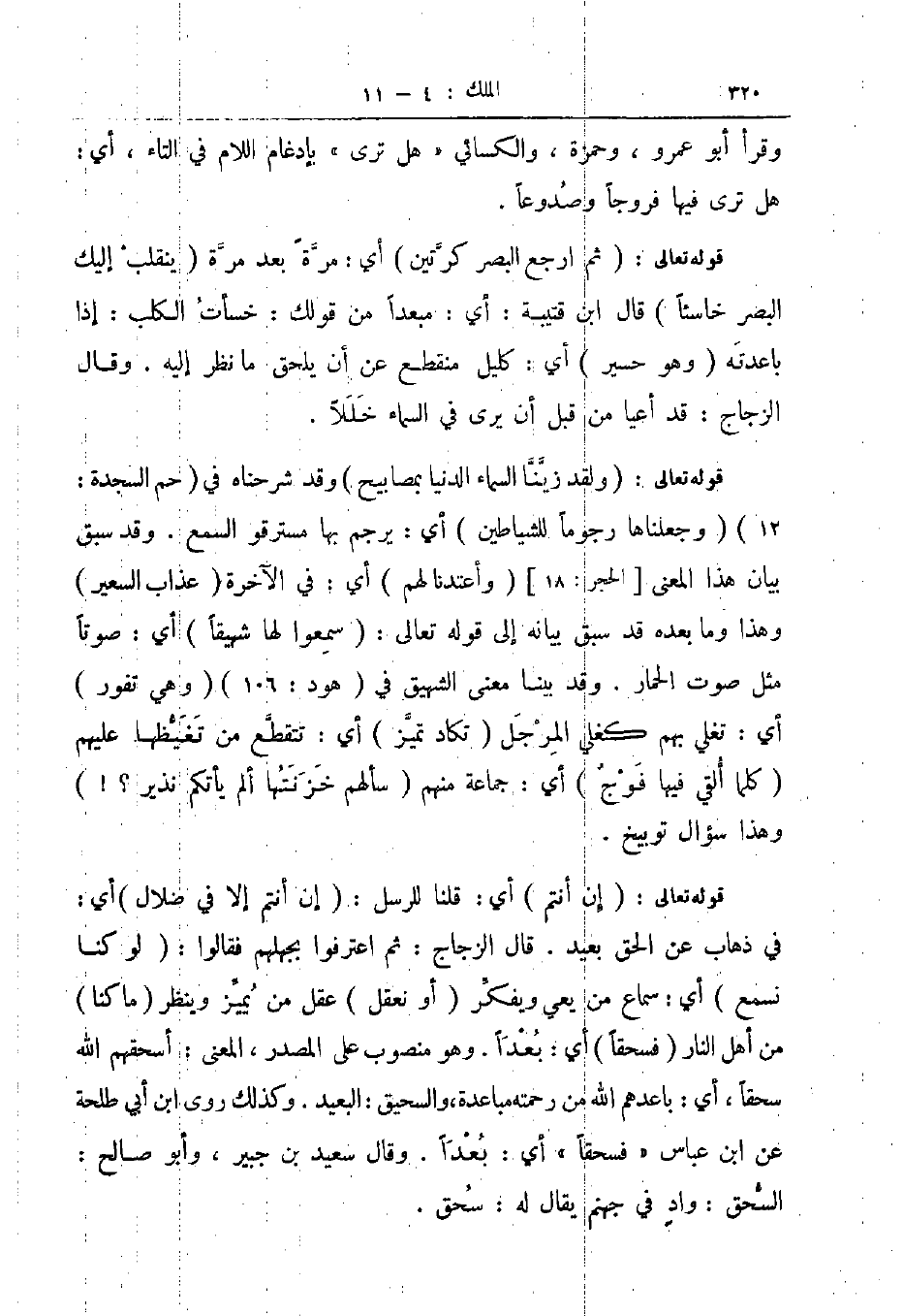 قوله تعالى ولقد زينا السماء الدنيا بمصابيح وقد شرناه في حم السجد 12 وجعلناها رجوما للشياطين أي يرجم بها مسترقوا السمع وقد سبق بيان هذا المعنى الحجر 18 وأعتدنا لهم أي في الآخرة عذاب السعير وهذا وما بعده قد سبق بيانه إلى قوله تعالى سمعوا لها شهيقا أي صوتا مثل صوت الحمار وقد بينا معنى الشهيق في هود 106 وهي تفور أي تغلي بهم كغلي المرجل تكاد تميز أي تتقطع من تغيظها عليهم كلما ألقي فيها فوج أي جماعة منهم سألهم خزنتها ألم يأتكم نذير وهذا سؤال توبيخ