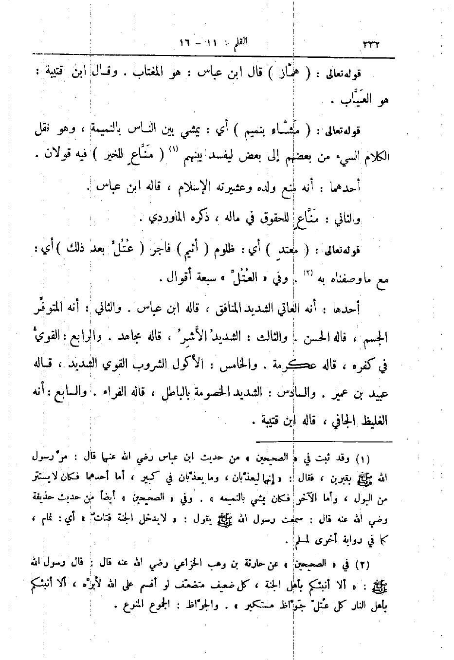 قوله تعالى مشاء بنميم أي يمشي بين الناس بالنميمة وهو نقل الكلام السيء من بعضهم إلى بعض ليفسد بينهم مناع للخير فيه قولان