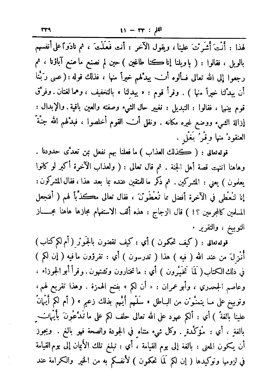 قوله تعالى كذلك العذاب ما فعلنا بهم نفعل بمن تعدى حدودنا وها هنا انتهت قصة أهل الجنة ثم قال تعالى ولعذاب الآخرة أكبر لو كانوا يعلمون يعني المشركين ثم ذكر ما للمتقين عنده بما بعد هذا فقال المشركون إنا لنعطى في الآخرة أفضل مما تعطون فقال تعالى مكذبا لهم فأنجعل المسلمين كالمجرمين قال الزجاج هذه ألف الاستفهام مجازها ها هنا مجاز التوبيخ والتقرير