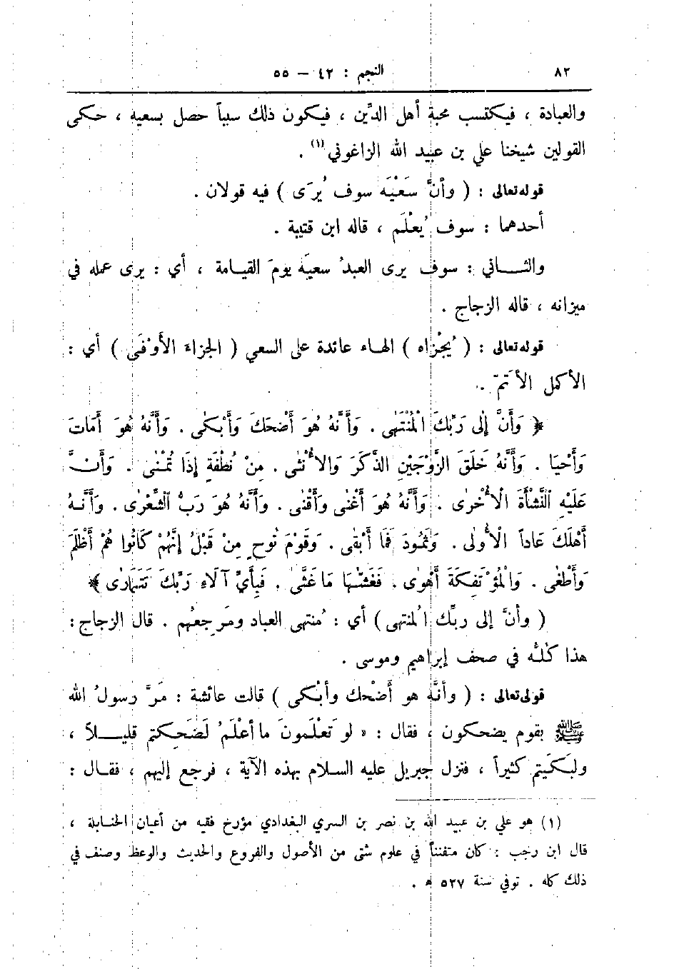 قوله تعالى وأنه هو أضحك وأبكى قالت عائشة مرة رسول الله صلى الله عليه و سلم بقوم يضحكون فقال لو تعلمون ما أعلم لضحكتم قليلا ولبكيتم كثيرا فنزل جبريل عليه السلام بهذه الآية فرجع إليهم فقال