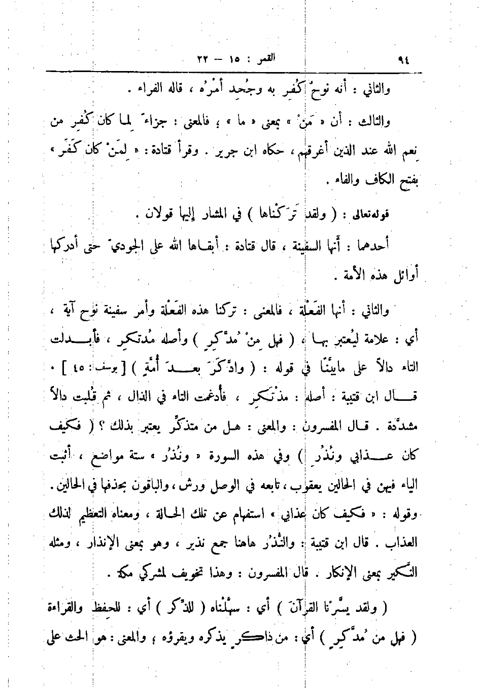 والثاني أنها الفعلة فالمعنى تركنا هذه الفعلة وأمر سفينة نوح آية أي علامة ليعتبر بها فهل من مدكر وأصله مدتكر فأبدلت التاء دالا على ما بينا في قوله وادكر بعد أمة يوسف 45 قال ابن قتيبة أصله مذتكر فأدغمت التاء في الذال ثم قلبت دالا مشددة قال المفسرون والمعنى هل من متذكر يعتبر بذلك فكيف كان عذابي ونذر وفي هذه السورة ونذر ستة مواضع أثبت الياء فيهن في الحالين يعقوب تابعه في الوصل ورش والباقون بحذفها في الحالين وقوله فكيف كان عذابي استفهام عن تلك الحالة ومعناه التعظيم لذلك العذاب قال ابن قتيبة والنذر ها هنا جمع نذير وهو بمعنى الإنذار ومثله النكير بمعنى الإنكار قال المفسرون وهذا تخويف لمشركي مكة
