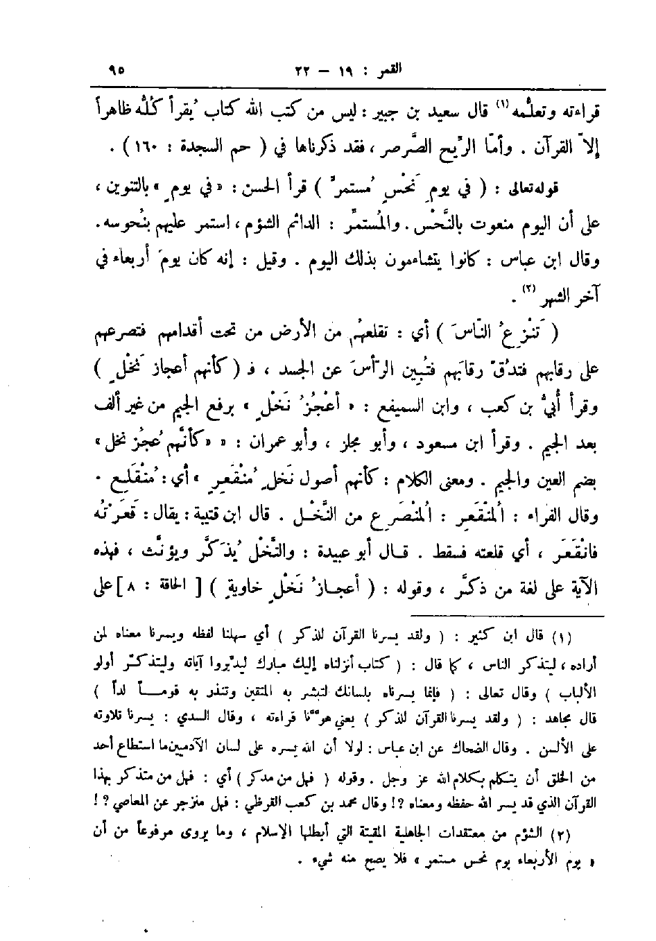 تنزع الناس أي تقلعهم من الأرض من تحت أقدامهم فتصرعهم على رقابهم فتدق رقابهم فتبين الرأس عن الجسد ف كأنهم أعجاز نخل وقرأ أبي بن كعب وابن السميفع أعجز نخل برفع الجيم من غير ألف بعد الجيم وقرأ ابن مسعود وأبو مجلز وأبو عمران كأنهم عجز نخل بضم العين والجيم ومعنى الكلام كأنهم أصول نخل منقعر أي منقلع وقال الفراء المنقعر المنصرع من النخل قال ابن قتيبة يقال قعرته فانقعر أي قلته فسقط قال أبو عبيدة والنخل يذكر ويؤنث فهذه الآية على لغة من ذكر وقوله أعجاز نخل خاوية الحاقة 8 على