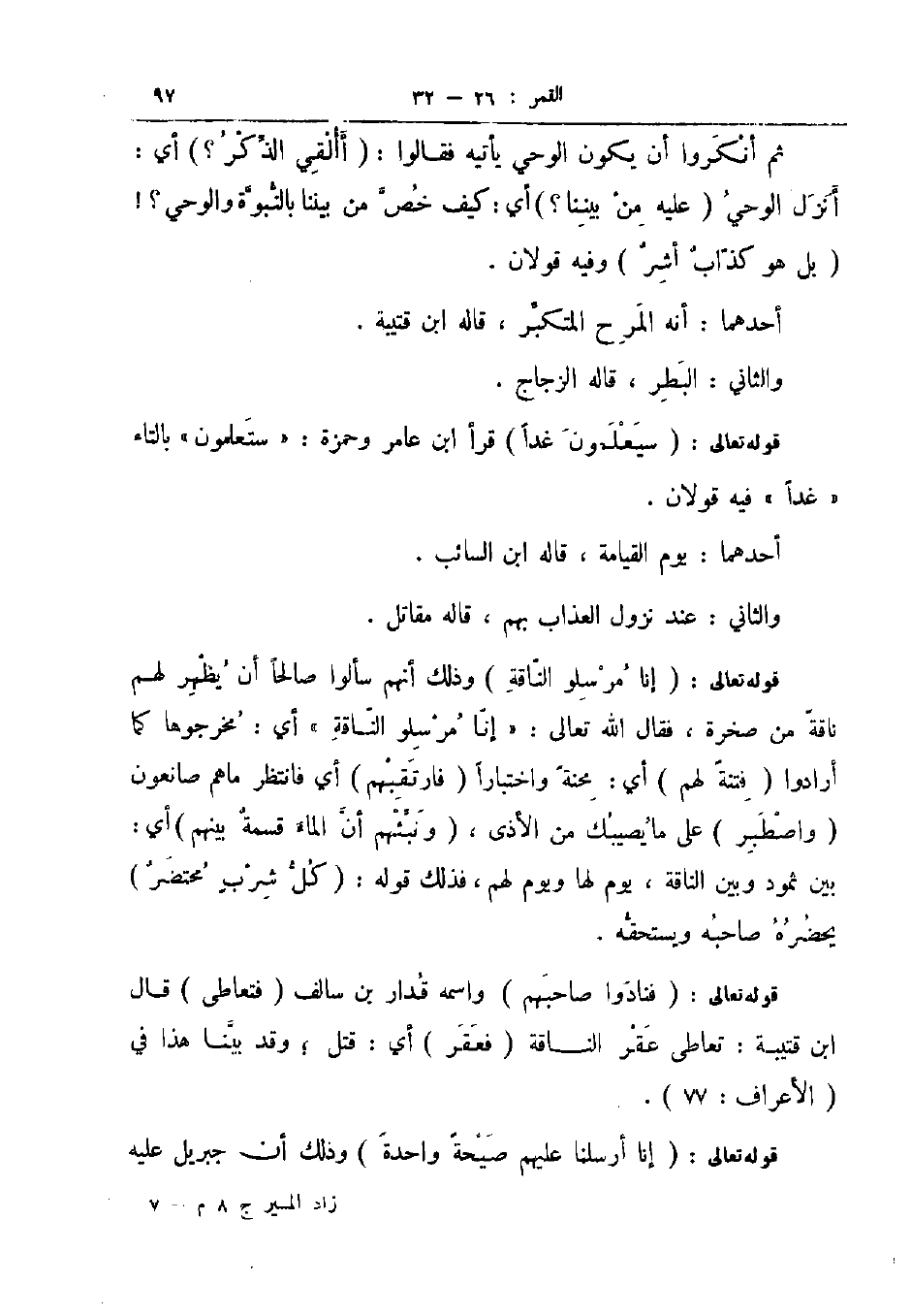 قوله تعالى إنا مرسلو الناقة وذلك أنهم سألوا صالحا أن يظهر لهم ناقة من صخرة فقال الله تعالى إنا مرسلو الناقة أي مخرجوها كما أرادوا فتنة لهم أي محنة واختبارا فارتقبهم أي فانتظر ما هم صانعون واصطبر على ما يصيبك من الأذى ونبئهم أن الماء قسمة بينهم أي بين ثمود وبين الناقة يوم لها ويوم لهم فذلك قوله كل شرب محتضر يحضره صاحبه ويستحقه