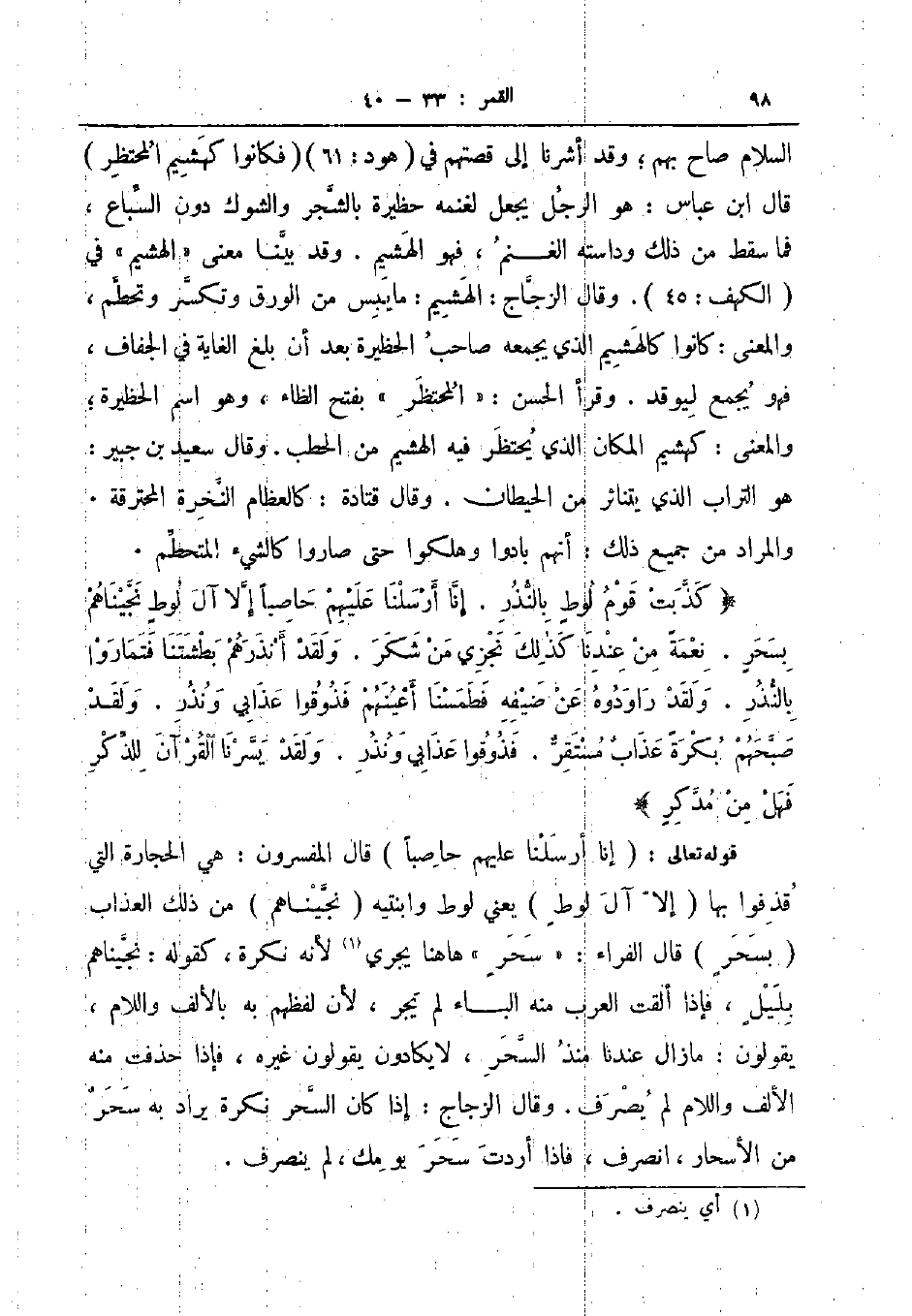قوله تعالى إنا أرسلنا عليهم حاصبا قال المفسرون هي الحجارة التي قذفوا بها إلا آل لوط يعني لوط وابنتيه نجيناهم من ذلك العذاب بسحر قال الفراء سحر ها هنا يجري لأنه نكرة كقوله نجيناهم بليل فإذا ألقت العرب منه الباء لم يجر لأن لفظهم به بالألف واللام يقولون ما زال عندنا منذ السحر لا يكادون يقولون غيره فإذا حذفت منه الألف واللام لم يصرف وقال الزجاج إذا كان السحر نكرة يراد به سحر من الأسحار انصرف فإذا أردت سحر يومك لم ينصرف