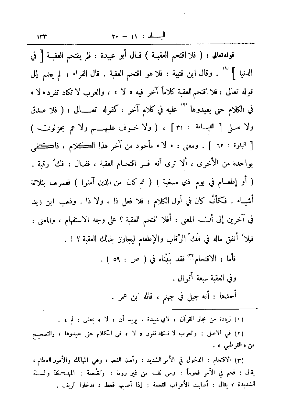 قوله تعالى فلا اقتحم العقبة قال أبو عبيدة فلم يقتحم العقبة في الدنيا وقال ابن قتيبة فلا هو اقتحم العقبة قال الفراء لم يضم الى قوله تعالى فلا اقتحم العقبة كلاما آخر فيه لا والعرب لا تكاد تفرد لا في الكلام حتى يعيدوها عليه في كلام آخر كقوله تعالى فلا صدق ولا صلى القيامة 31 ولا خوف عليهم ولا هم يحزنون البقرة 62 ومعنى لا مأخوذ من آخر هذا الكلام فاكتفى بواحدة من الأخرى ألا ترى أنه فسر اقتحام العقبة فقال فك رقبة أو إطعام في يوم ذي مسبغة ثم كان من الذين آمنوا ففسرها بثلاثة أشياء فكأنه كان في أول الكلام فلا فعل ذا ولا ذا وذهب ابن زيد في آخرين الى أن المعنى أفلا اقتحم العقبة على وجه الإستفهام والمعنى فهلا أنفق ماله في فك الرقاب والإطعام ليجاوز بذلك العقبة