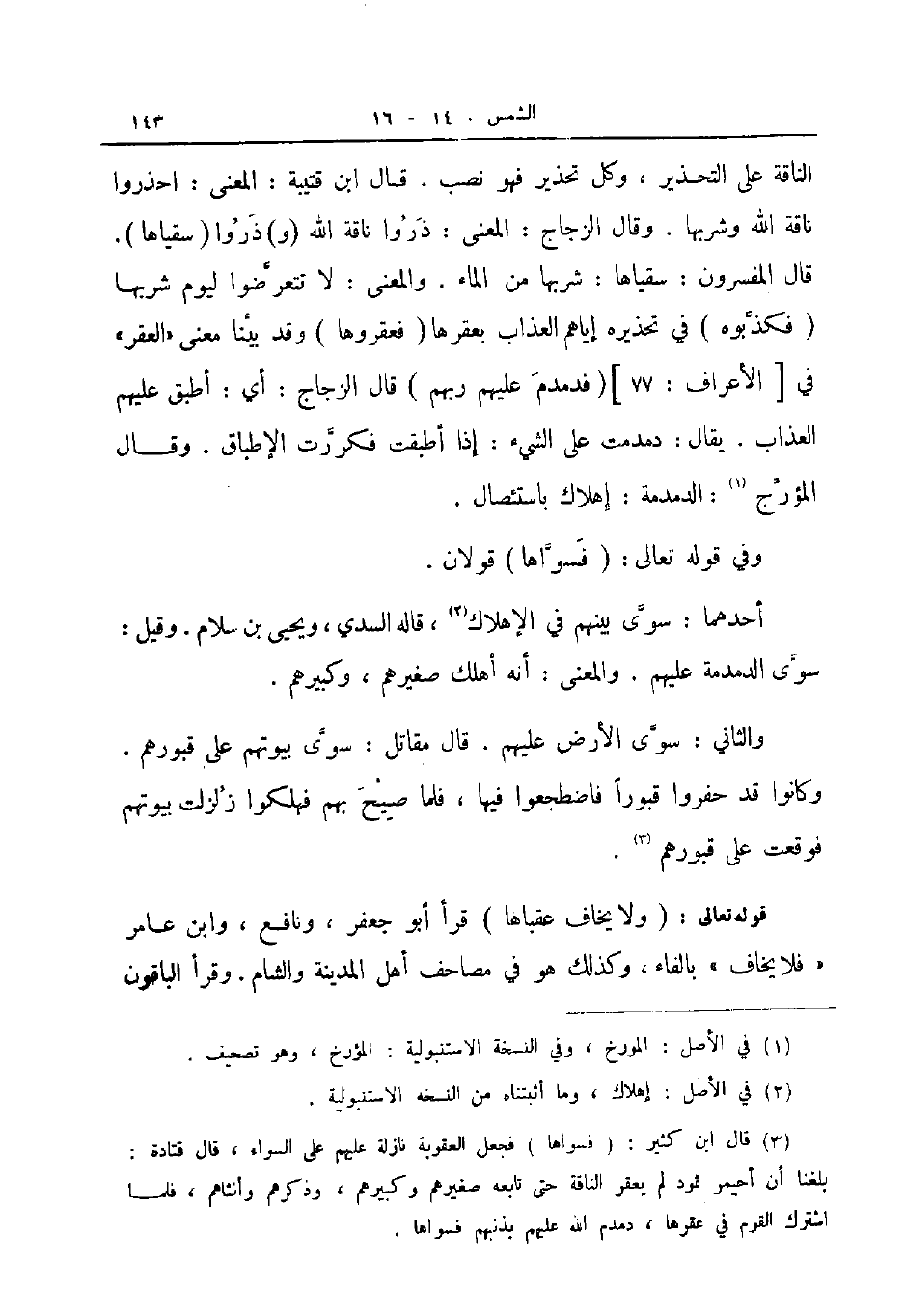 الناقة على التحذير وكل تحذير فهو نصب قال ابن قتيبة المعنى احذروا ناقة الله وشربها وقال الزجاج المعنى ذروا ناقة الله و ذروا سقياها قال المفسرون سقياها شربها من الماء والمعنى لا تتعرضوا ليوم شربها فكذبوه في تحذيره إياهم العذاب بعقرها فعقروها وقد بينا معنى العقر في الأعراف 77 فدمدم عليهم ربهم قال الزجاج أي أطبق عليهم العذاب يقال دمدمت على الشيء إذا أطبقت فكررت الإطباق وقال المؤرج الدمدمة إهلاك بإستئصال